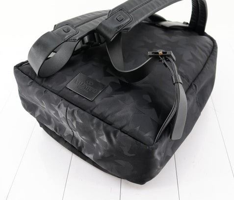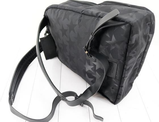 One Valentino Black Nylon Camustars Backpack. Item is sold AS-IS. All available information is listed in the description and shown in the photo. Valentino Camustars Backpack features black printed nylon with featuring zip fastening, gunmetal hardware, a front zipped pocket, leather adjustable shoulder straps and leather top handle. 13" x 16.1" x 8.3"