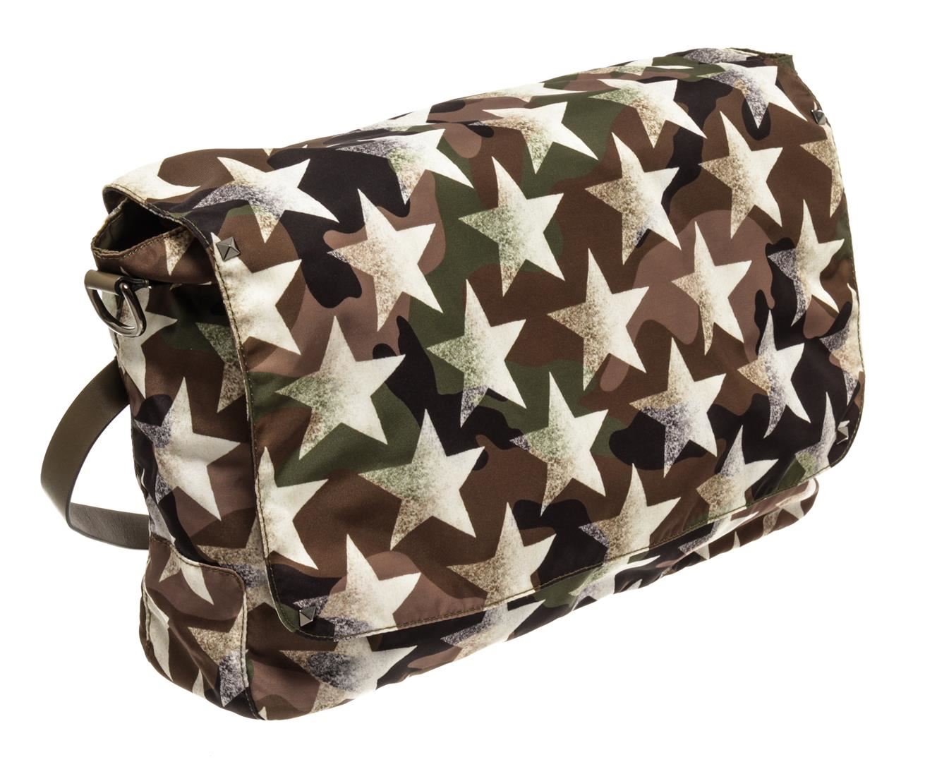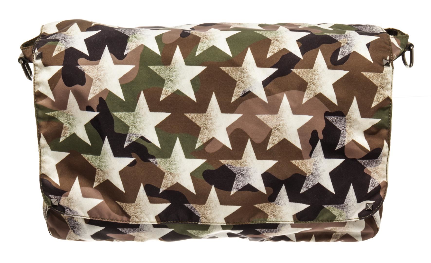 One Valentino Camouflage Camustars Messenger Bag. Item is sold AS-IS. All available information is listed in the description and shown in the photo. Valentino Camouflage Camustars Messenger Bag with shoulder strap, stars, nylon lining, interior zipper pocket, two slip pockets, snap closure.