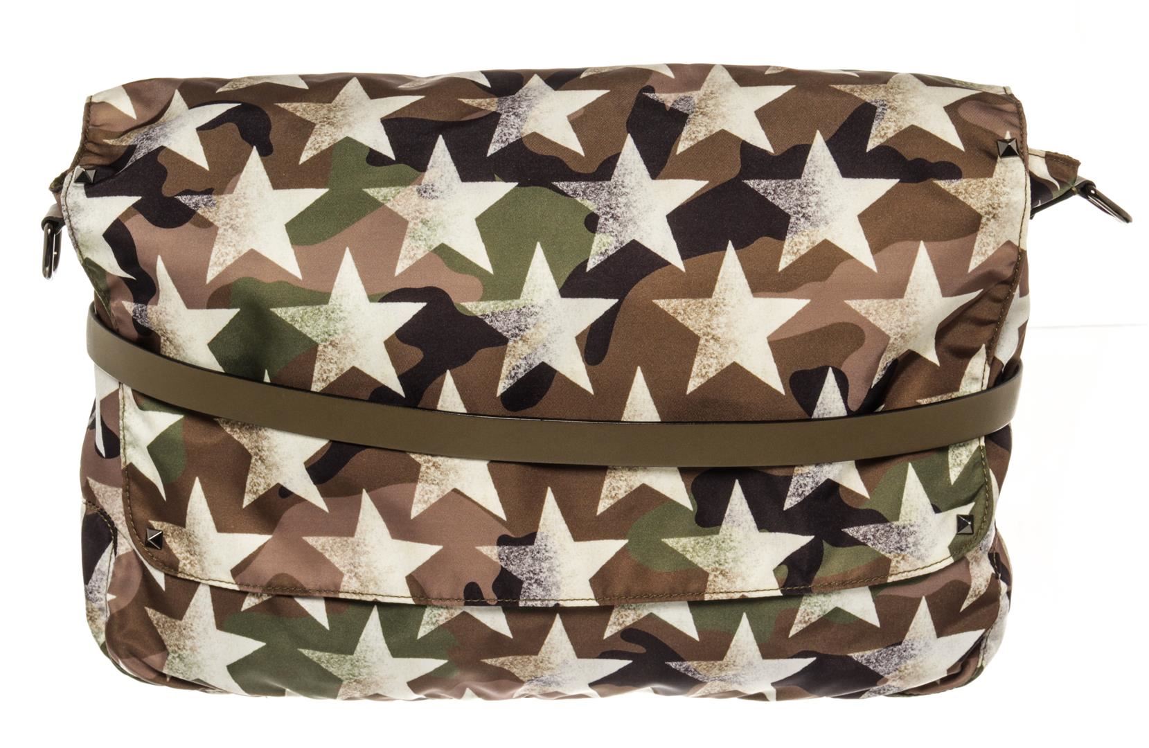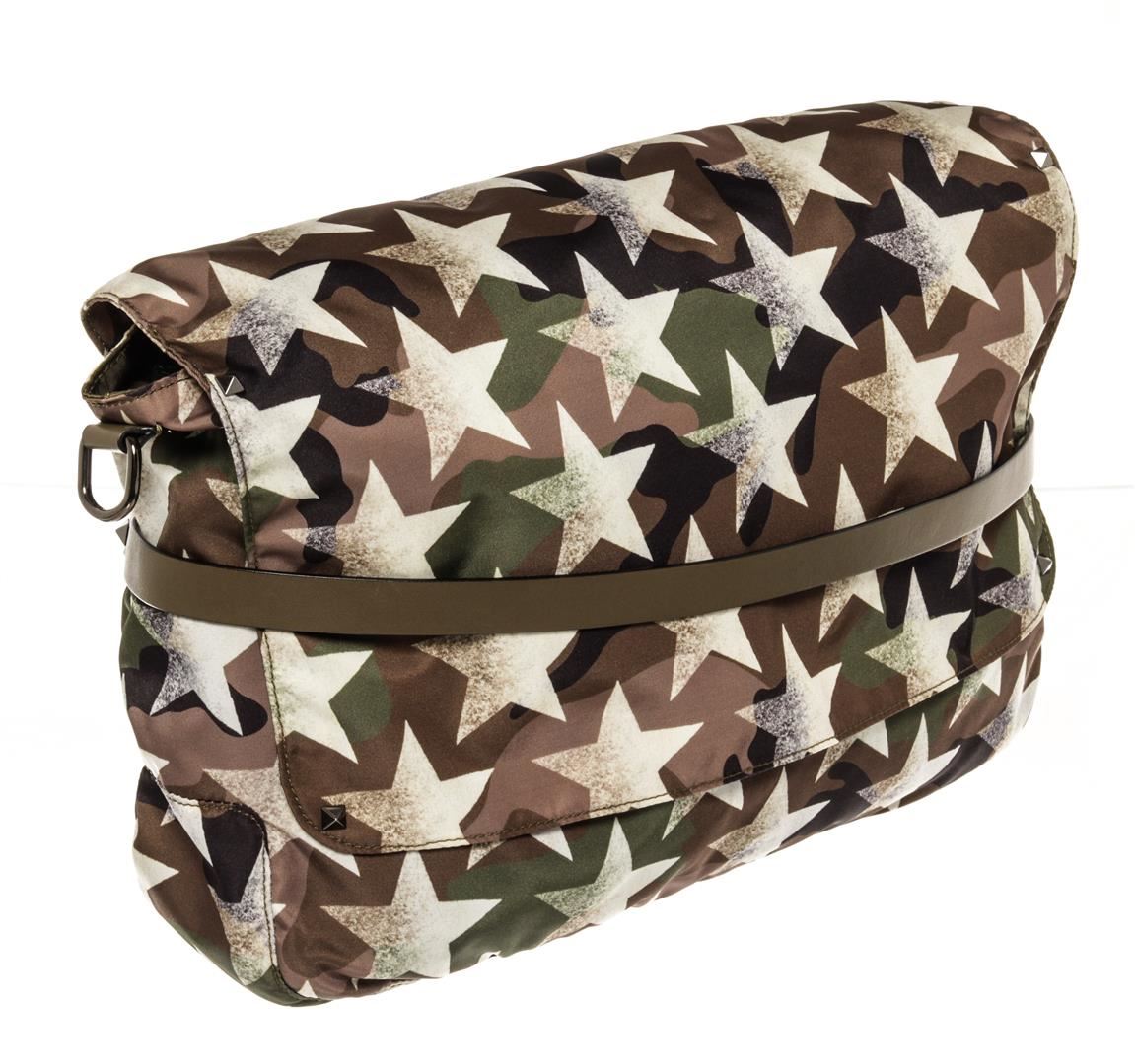 One Valentino Camustars Messenger Printed Camo Nylon Large Print. Item is sold AS-IS. All available information is listed in the description and shown in the photo. Valentino Camustars Messenger Printed Camo Nylon Large Print Condition Details: Small nick on strap base trim, creasing and light wear on exterior and in interior, scratches on hardware. Height 12", Width 17", Depth 4", Strap Drop 15-26