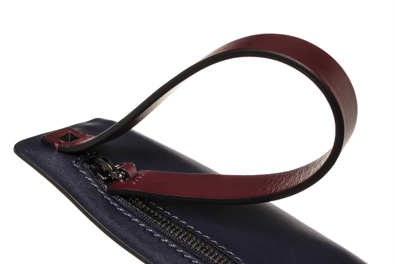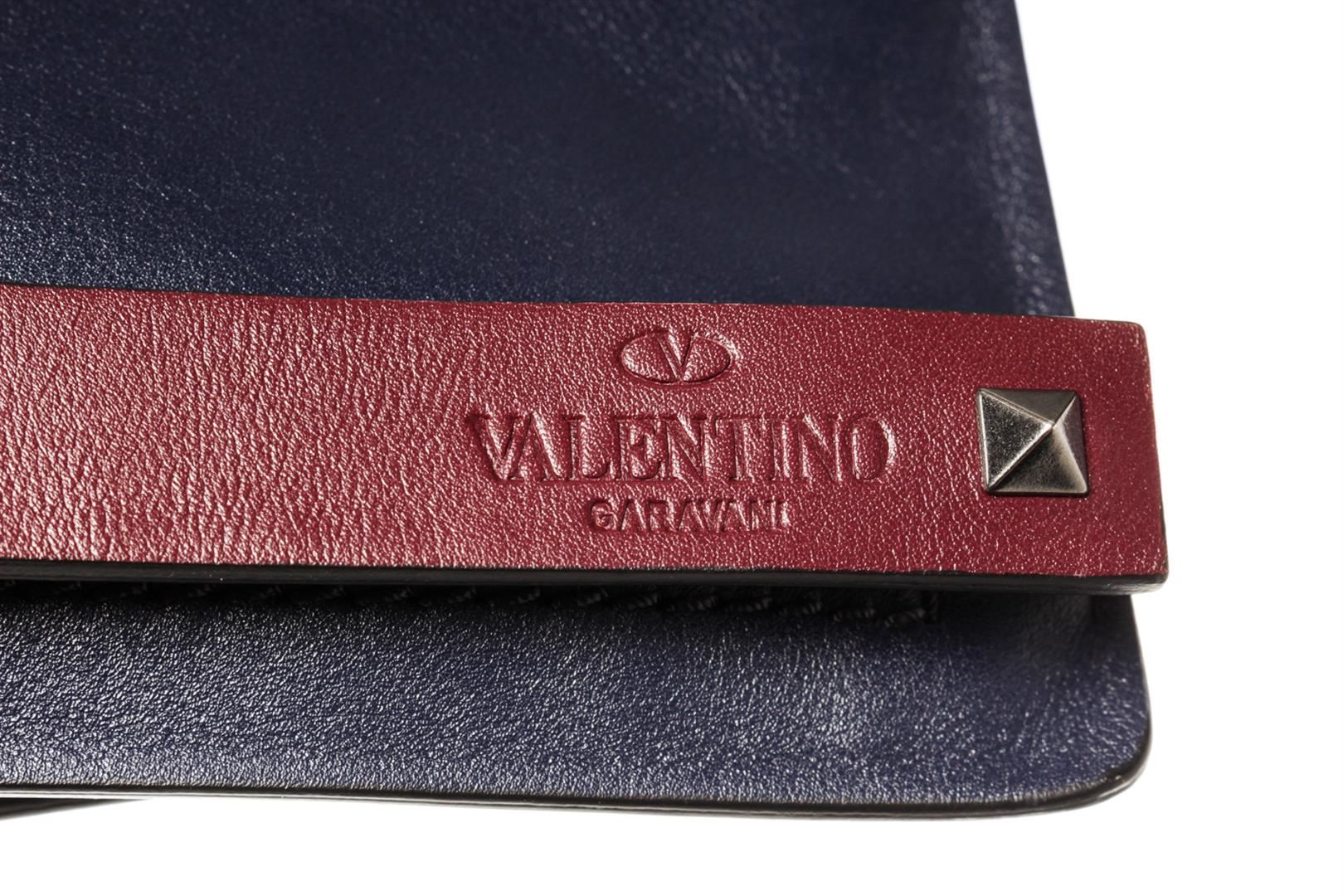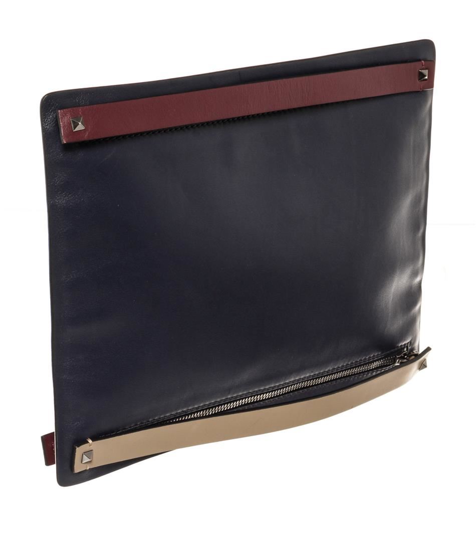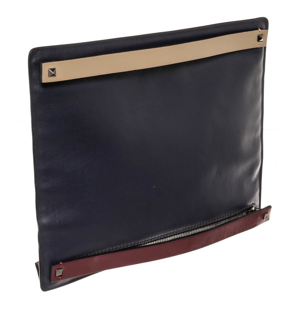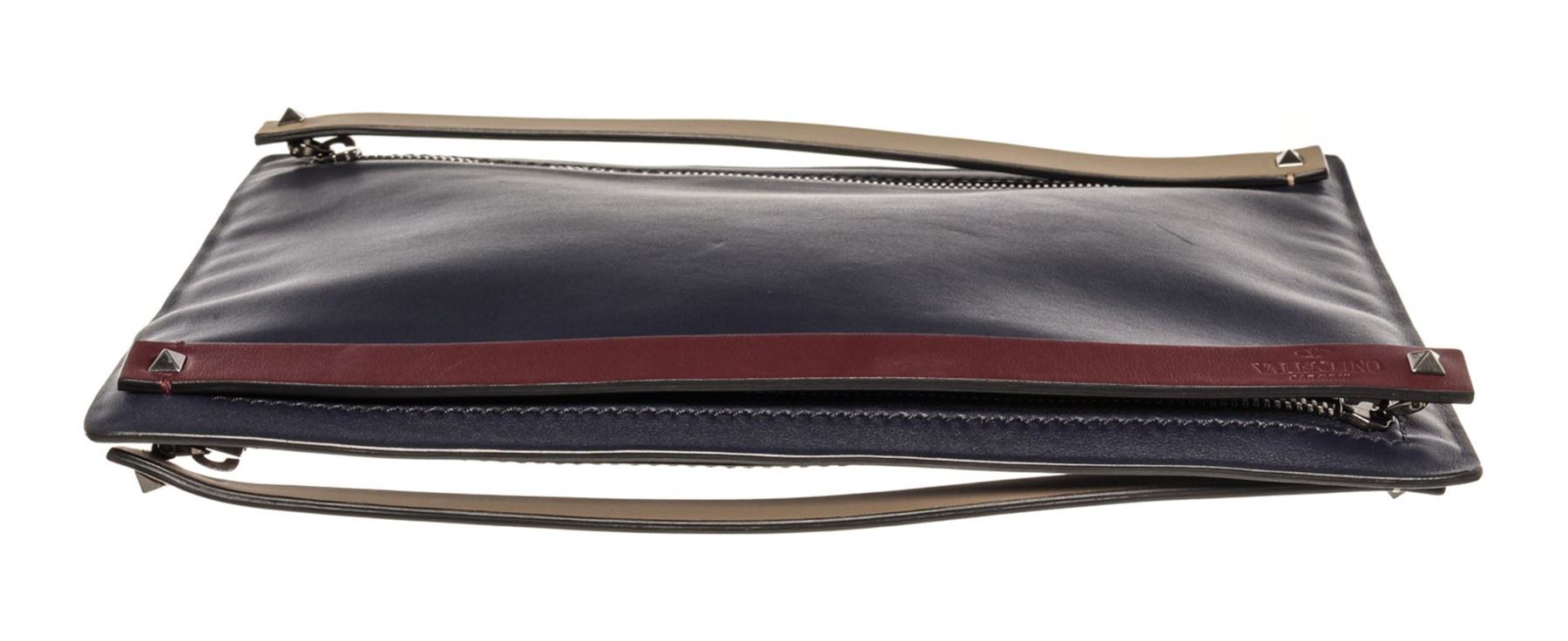 One Valentino Navy Blue Leather Double Zip Clutch. Item is sold AS-IS. All available information is listed in the description and shown in the photo. Navy blue leather Valentino Double Zip clutch with silver-tone hardware, two-tone handles crafted in beige and burgundy leather, stud adornments, dual zip closure and black canvas lining. W 30 in x H 7.8 in x D 0.3 in