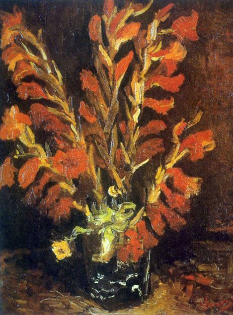Artist: Vincent Van Gogh - Title: Red Gladioli - Medium: Fine Art Reproduction Giclee on Archival Canvas - Image Size: Approximately 20 inches x 14.75 inches - Unframed on Unstretched Canvas - Biography: Vincent van Gogh (born March 30, 1853, Zundert, Neth.--died July 29, 1890, Auvers-sur-Oise, near Paris, France), - Van Gogh was a Dutch painter, generally considered the greatest after Rembrandt, and one of the greatest of the Post-Impressionists. The striking color, emphatic brushwork, and contoured forms of his work powerfully influenced the current of Expressionism in modern art. Van Gogh's art became astoundingly popular after his death, especially in the late 20th century, when his work sold for record-breaking sums at auctions around the world and was featured in blockbuster touring exhibitions. In part because of his extensive published letters, van Gogh has also been mythologized in the popular imagination as the quintessential tortured artist.