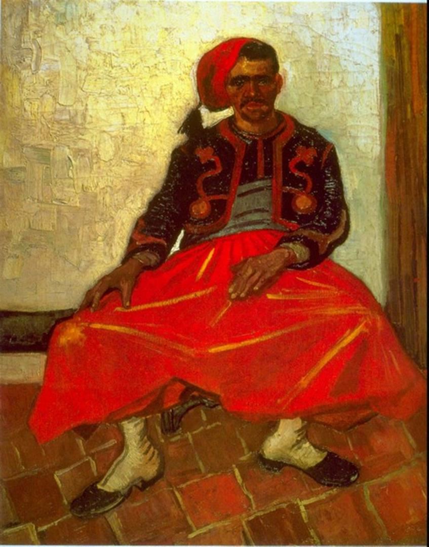 Artist: Vincent Van Gogh - Title: Zouave - Medium: Fine Art Reproduction Giclee on Archival Canvas - Image Size: Approximately 32 inches x 25 inches - Unframed on Unstretched Canvas - Biography: Vincent van Gogh (born March 30, 1853, Zundert, Neth.--died July 29, 1890, Auvers-sur-Oise, near Paris, France), - Van Gogh was a Dutch painter, generally considered the greatest after Rembrandt, and one of the greatest of the Post-Impressionists. The striking color, emphatic brushwork, and contoured forms of his work powerfully influenced the current of Expressionism in modern art. Van Gogh's art became astoundingly popular after his death, especially in the late 20th century, when his work sold for record-breaking sums at auctions around the world and was featured in blockbuster touring exhibitions. In part because of his extensive published letters, van Gogh has also been mythologized in the popular imagination as the quintessential tortured artist.