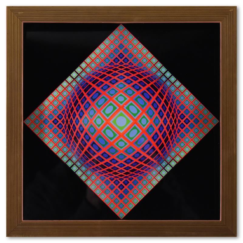 "Vega - 201 de la série Vega" is a heliogravure print on paper, published in 1971, by Victor Vasarely (1908-1997). This piece comes custom framed, with a letter of authenticity and with a 1976 Vasarely paperback. Measures approx. 11.5" x 11.5" (frame), 9" x 9" (image).