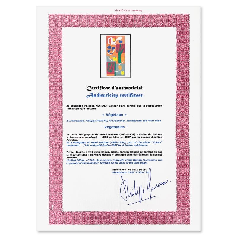 "Vegetaux" is a limited edition lithograph by Henri Matisse (1869-1954) bearing the plate signature of the artist. This piece comes from an edition of 200 authorized by the Matisse Estate; the edition number is not on the piece itself but on the certificate. Includes Certificate of Authenticity. Measures approx. 25" x 35.5" (image).