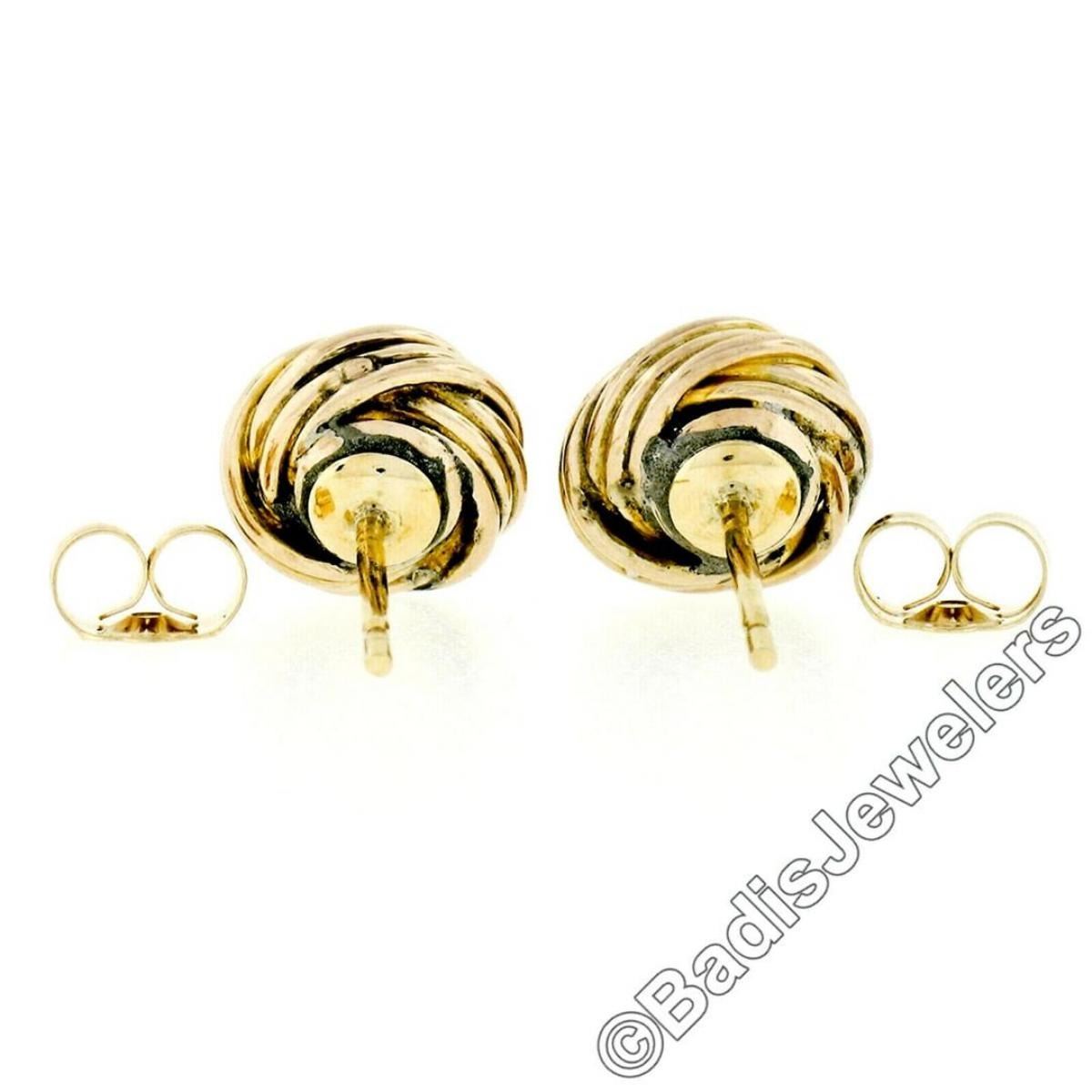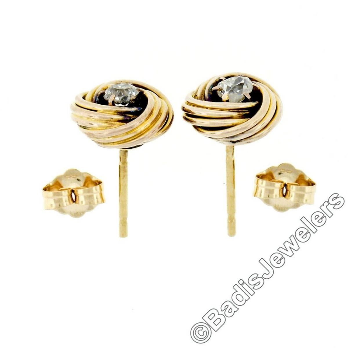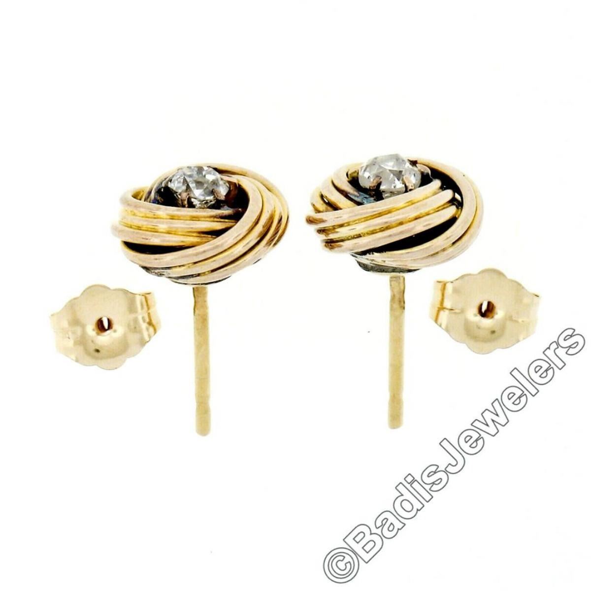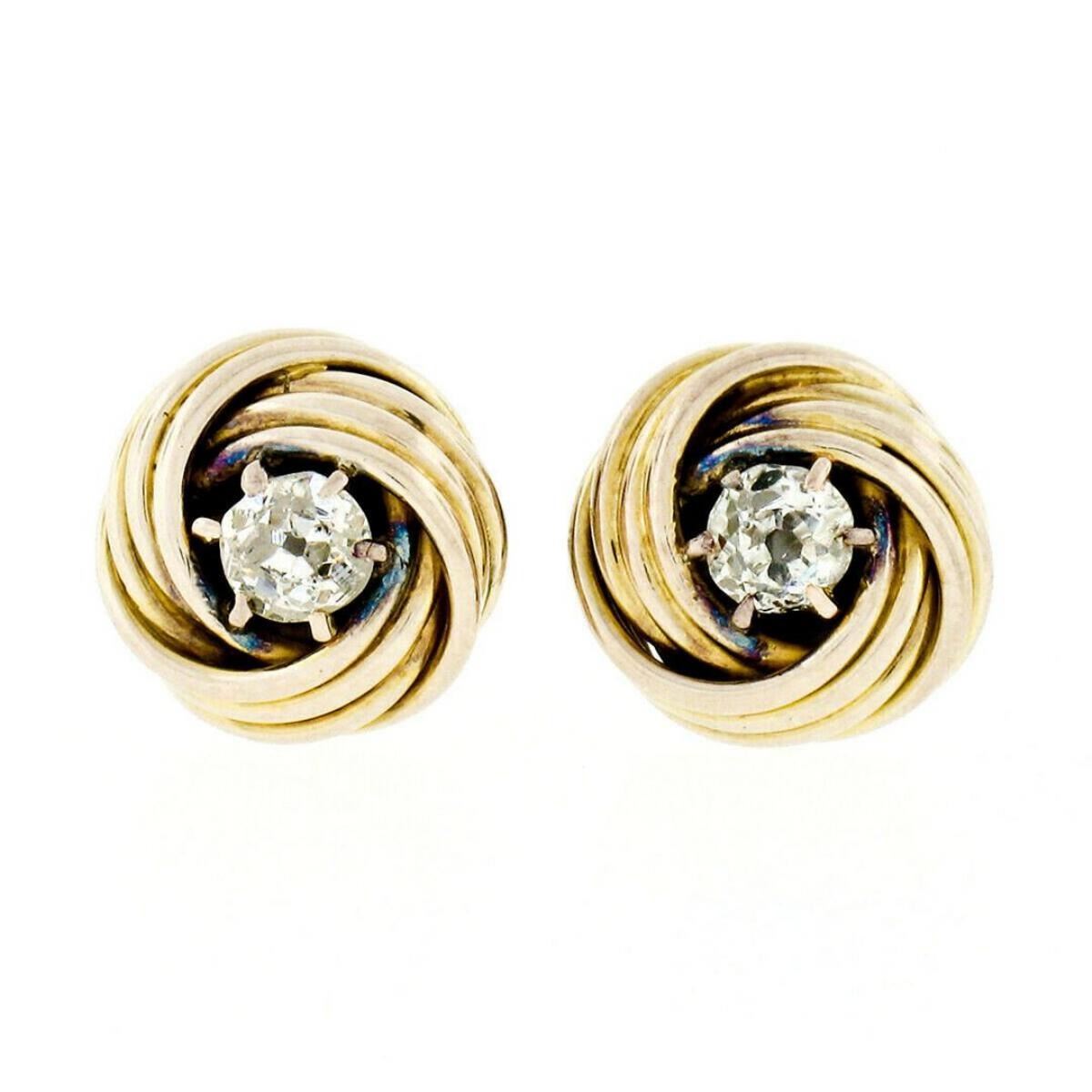 Victorian era 14kt yellow gold love knot stud earrings featuring a pair of old mine cut diamonds (G/H - SI1/SI2; 0.36ctw). The earrings measure approximately 9.2mm in diameter and weigh a total of 3.00 grams.