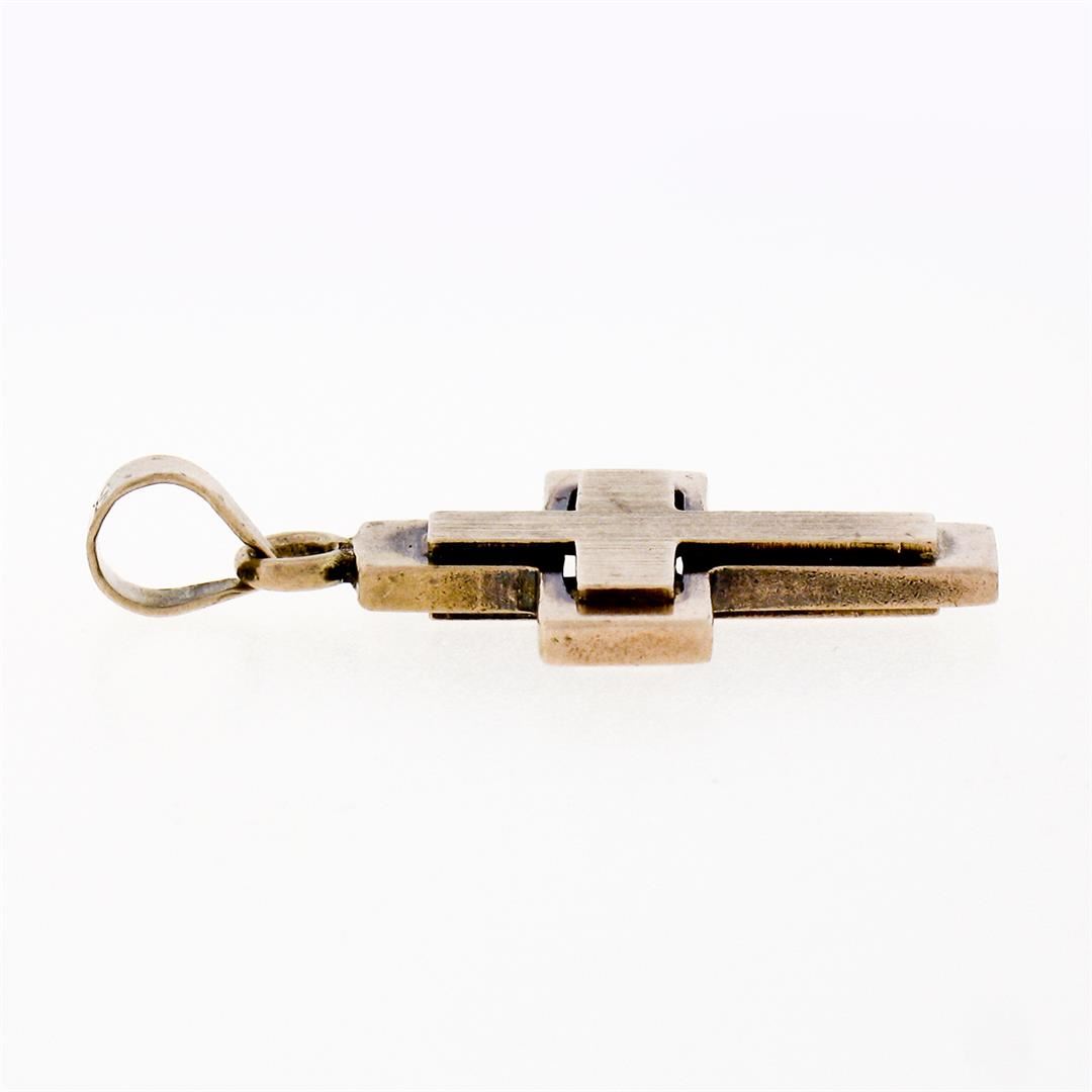A Victorian era 8k rose gold reversible cross pendant featuring a brushed inner section surrounded by a polished frame. The pendant weighs a total of 2.01 grams, measures 26.6x15.0mm including the bail, and the inside of the bail measures 4.0x3.5mm.