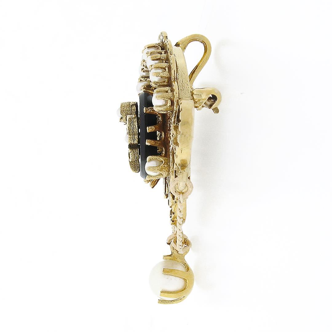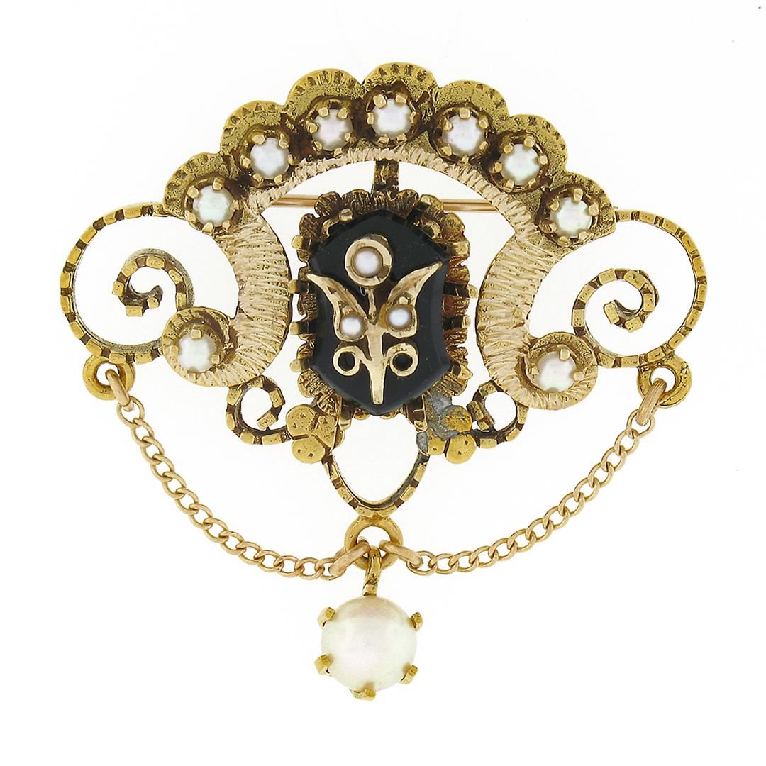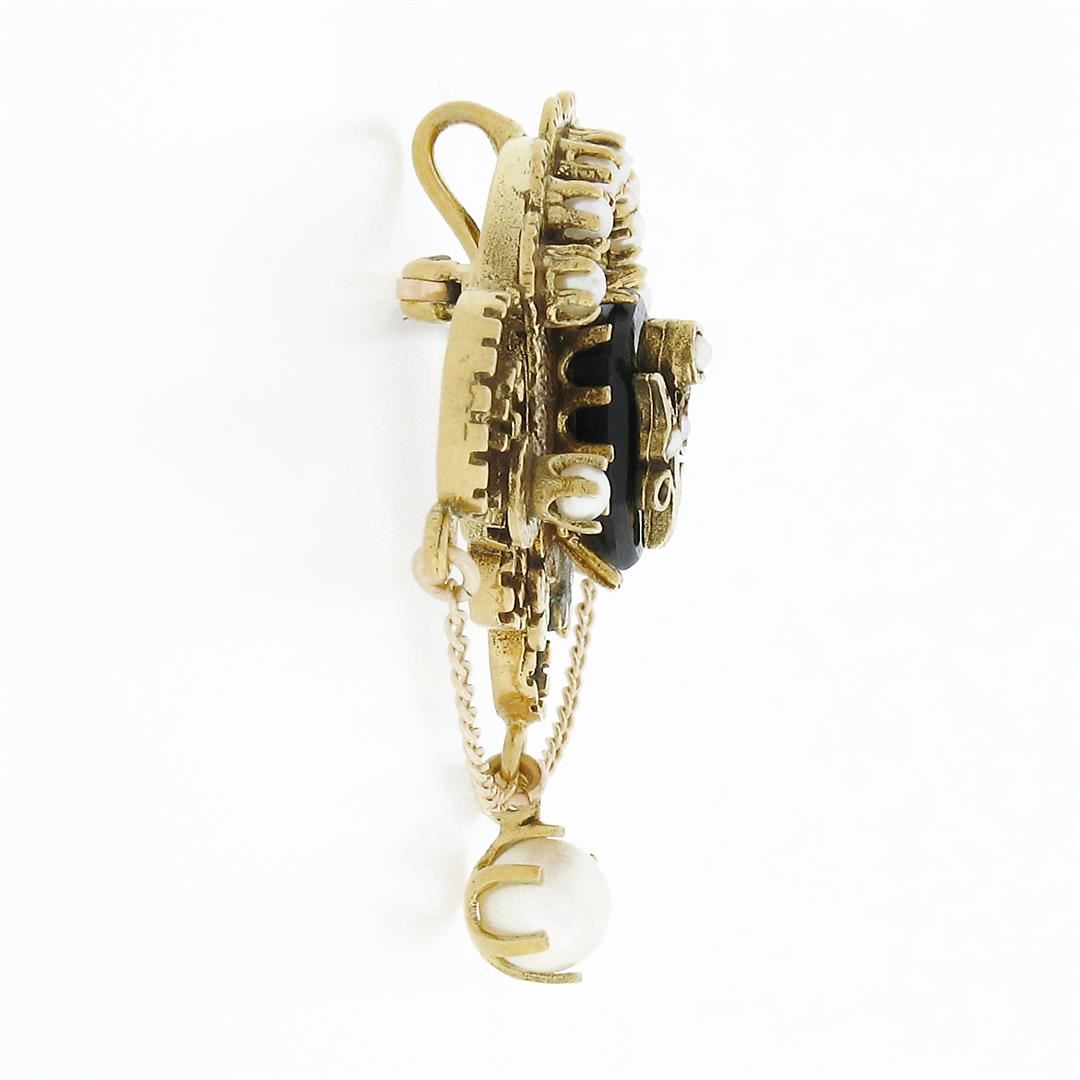 A vintage solid 14k yellow gold brooch pendant, with 1 custom cut black onyx (11.60x7.60mm), 12 round shape cultured seed pearls (1.4mm to 2.2mm each), and 1 round shape cultured pearl (5.5mm). Measures 37.0x36.80mm and weighs a total of 9.26 grams.