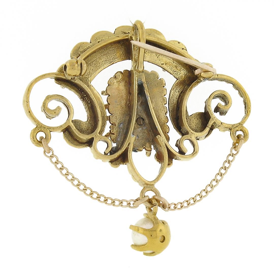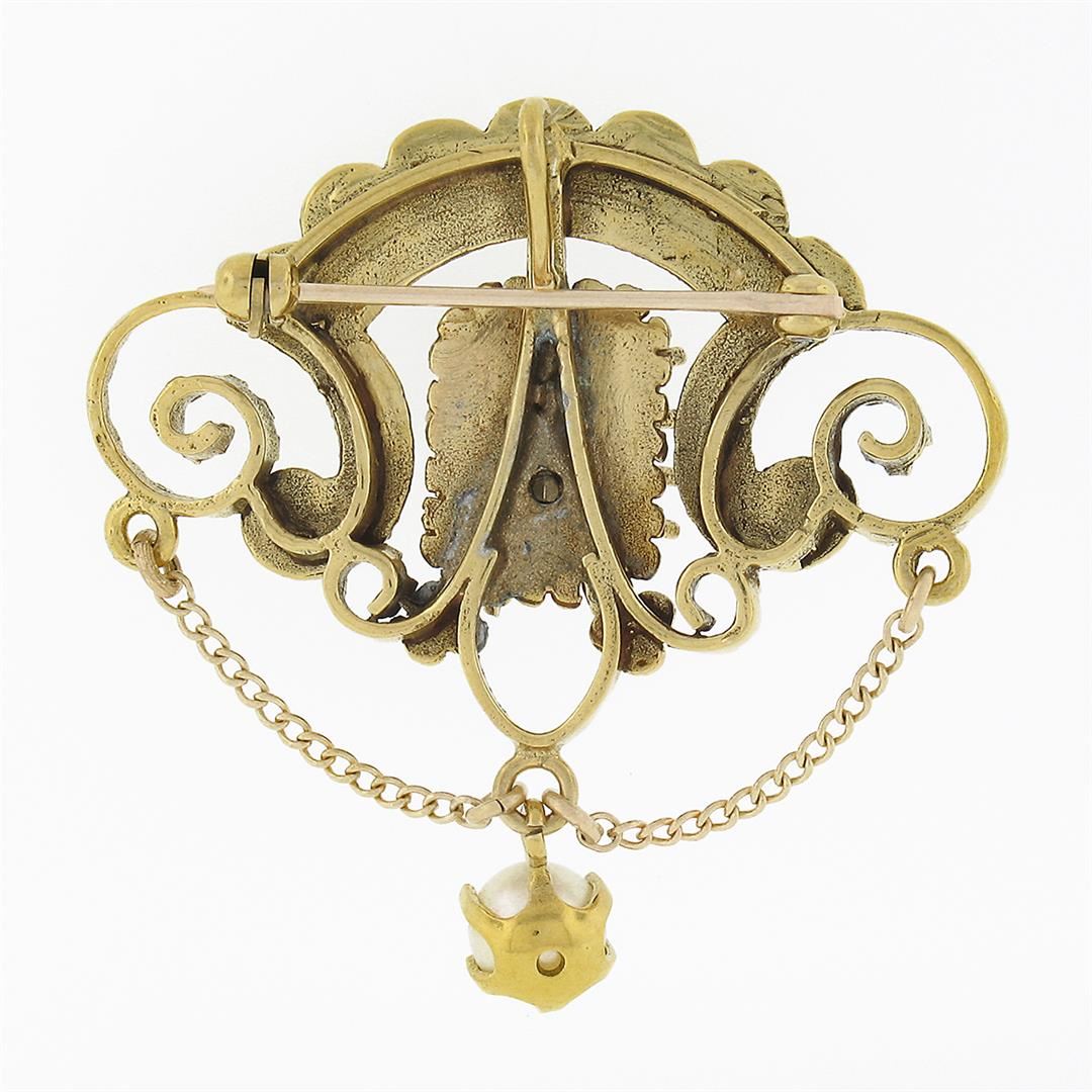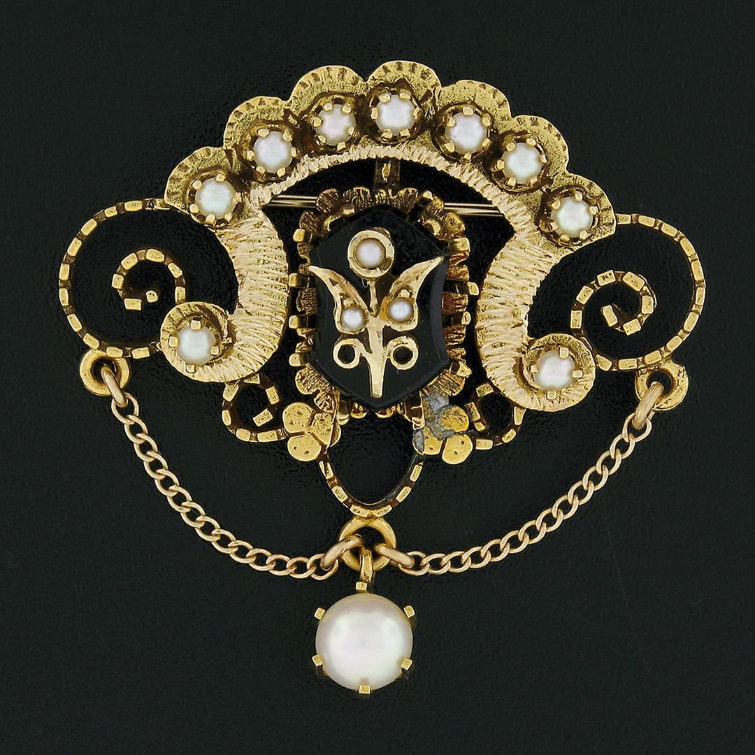 A vintage solid 14k yellow gold brooch pendant, with 1 custom cut black onyx (11.60x7.60mm), 12 round shape cultured seed pearls (1.4mm to 2.2mm each), and 1 round shape cultured pearl (5.5mm). Measures 37.0x36.80mm and weighs a total of 9.26 grams.