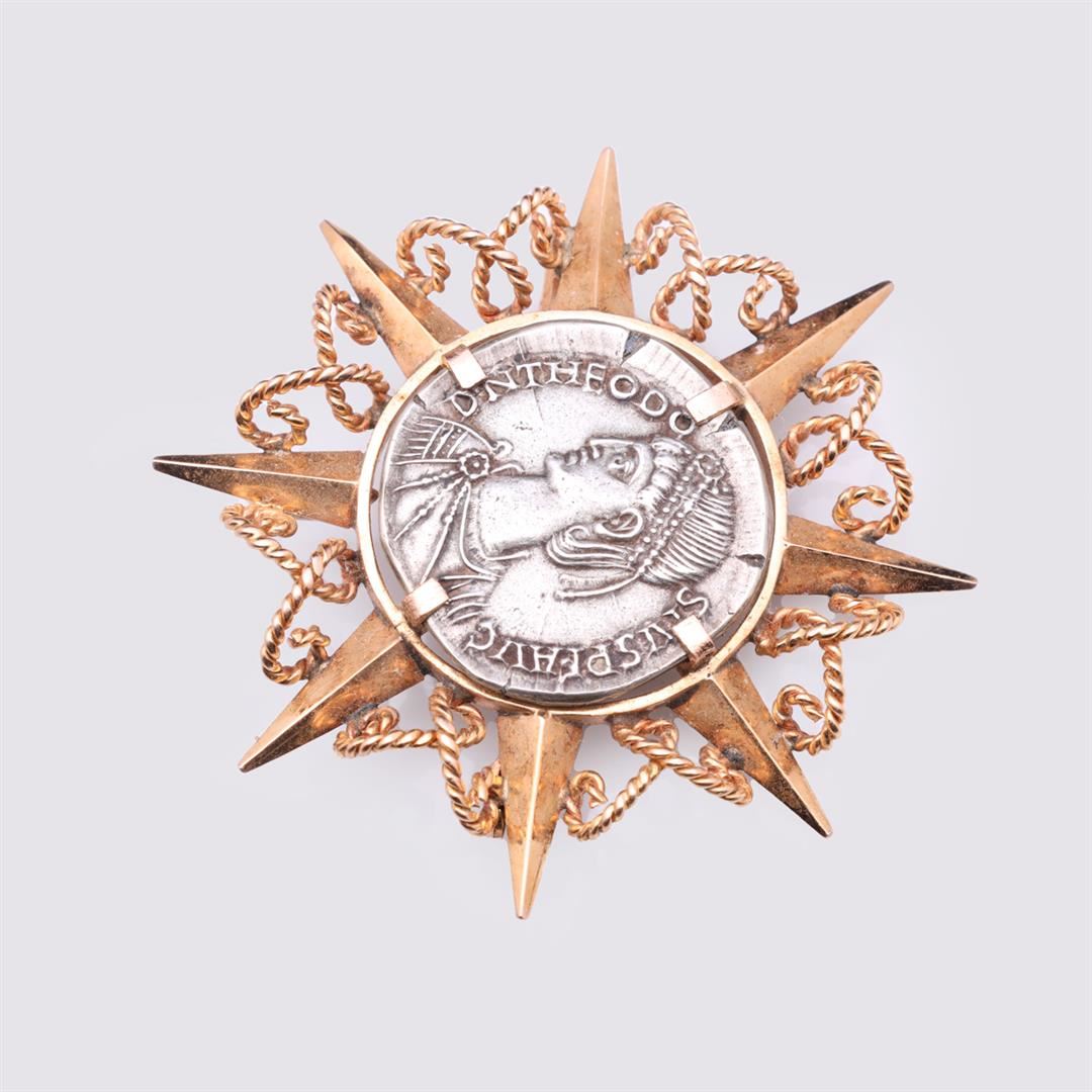 Victorian 14K Rose Gold Pendant/Brooch Mounted With Silver Byzantine Coin. Total weight is 10.7 gm. Estimated retail value $1,000.