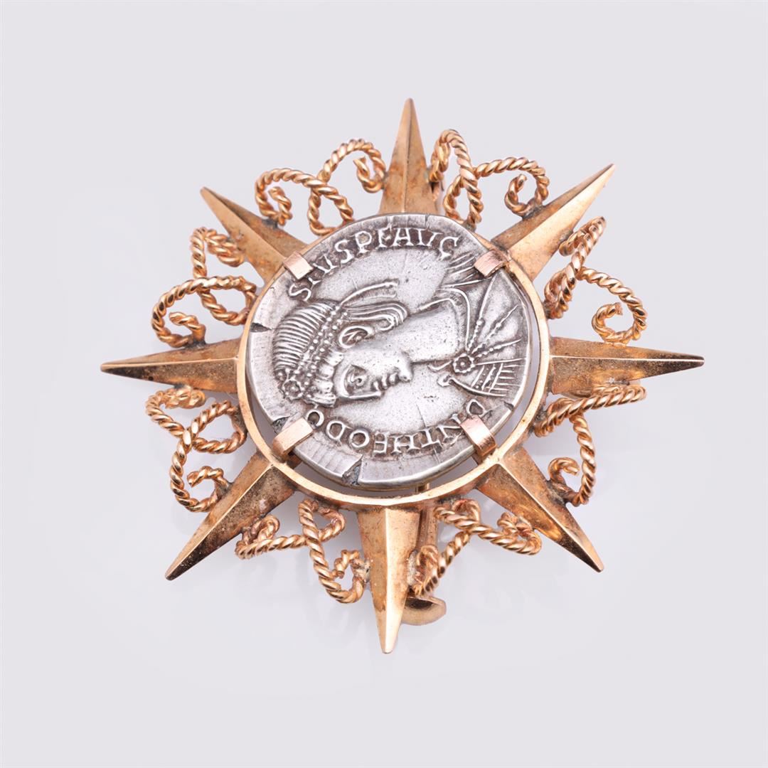 Victorian 14K Rose Gold Pendant/Brooch Mounted With Silver Byzantine Coin. Total weight is 10.7 gm. Estimated retail value $1,000.