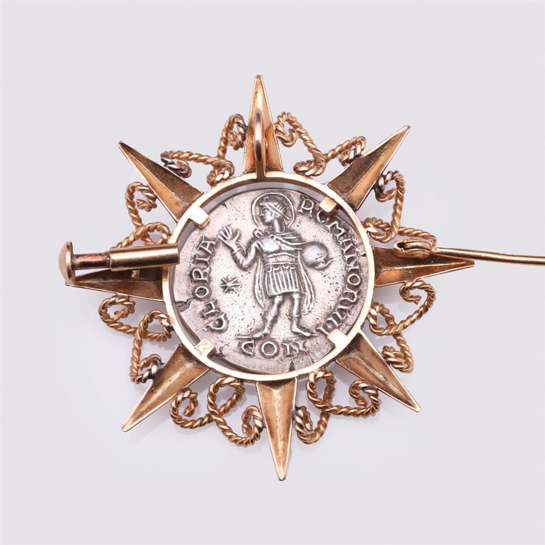 Victorian 14K Rose Gold Pendant/Brooch Mounted With Silver Byzantine Coin. Total weight is 10.7 gm. Estimated retail value $1,000.