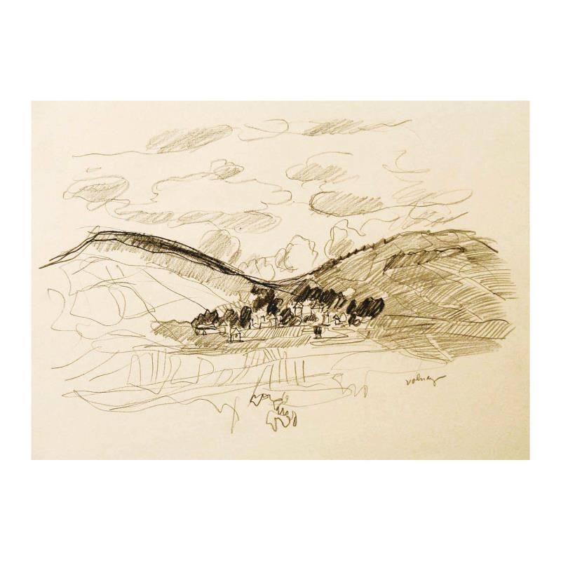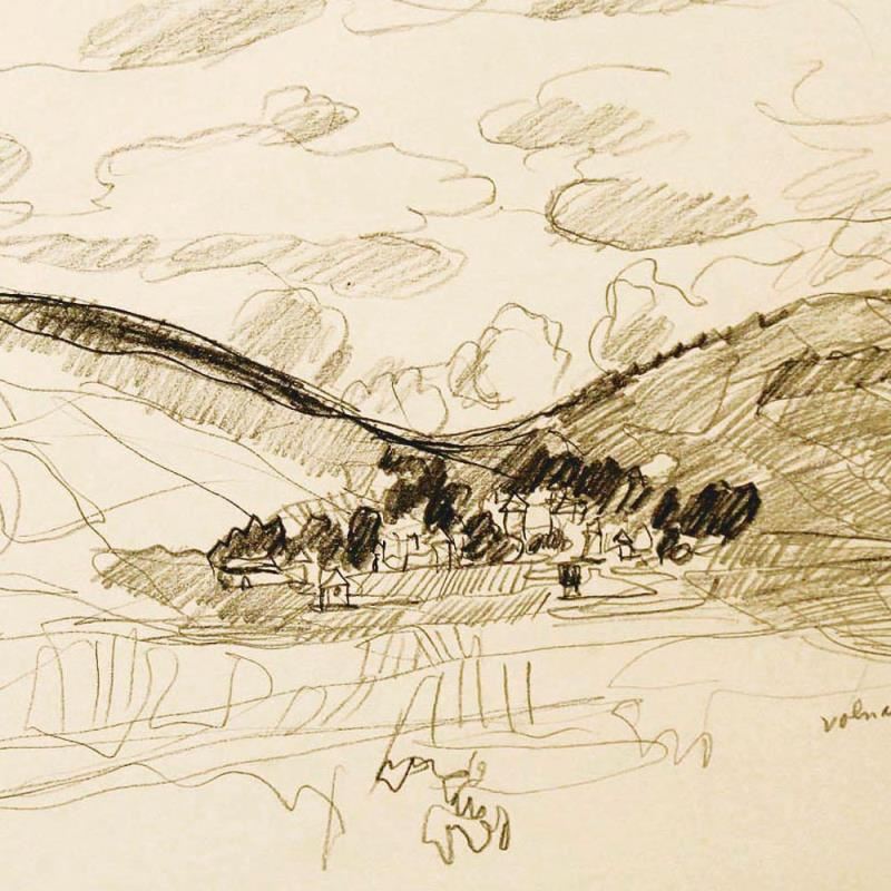 "View of Volnay in Burgundy" is an original Pencil on Paper by Wayne Ensrud. The piece is hand signed by the artist and comes with a Certificate of Authenticity. Measures approximately 15" x 18".