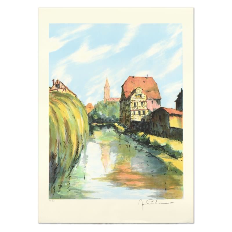 "Village Breton" is a limited edition lithograph on paper by Laurant, numbered and hand signed by the artist. Measures approx. 21" x 29.5" (border), 18" x 25" (image).