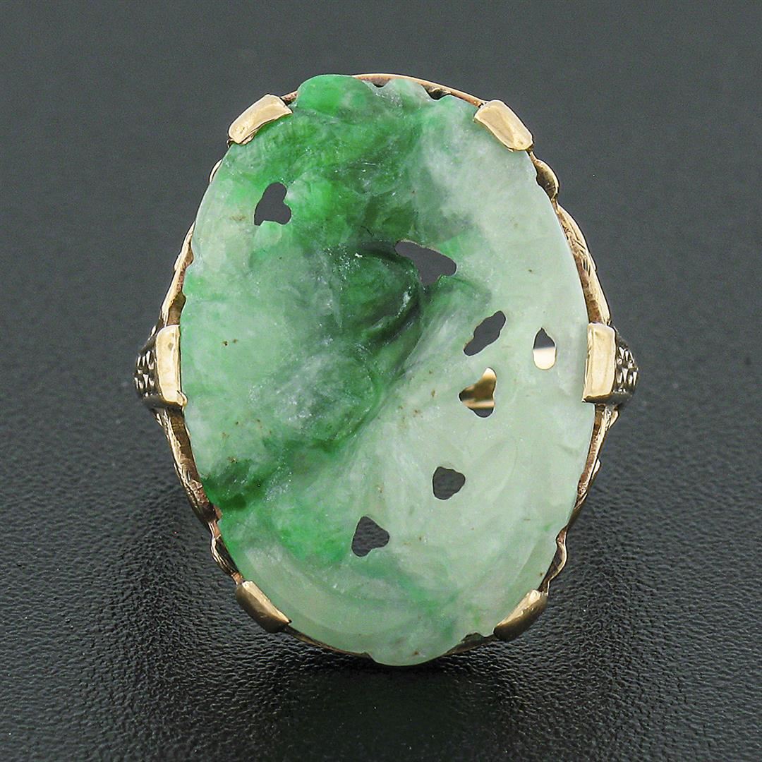 A vintage solid 10k yellow gold platter ring, with 1 oval carved natural jade (20.70x14.30mm). The ring is size 5.0, weighs a total of 3.58 grams, and measures 20.70mm wide.