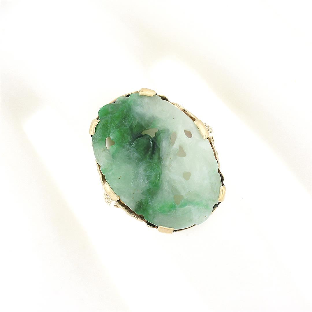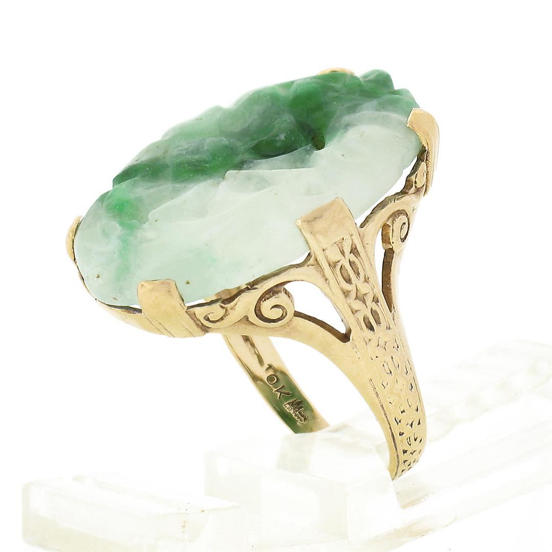 A vintage solid 10k yellow gold platter ring, with 1 oval carved natural jade (20.70x14.30mm). The ring is size 5.0, weighs a total of 3.58 grams, and measures 20.70mm wide.
