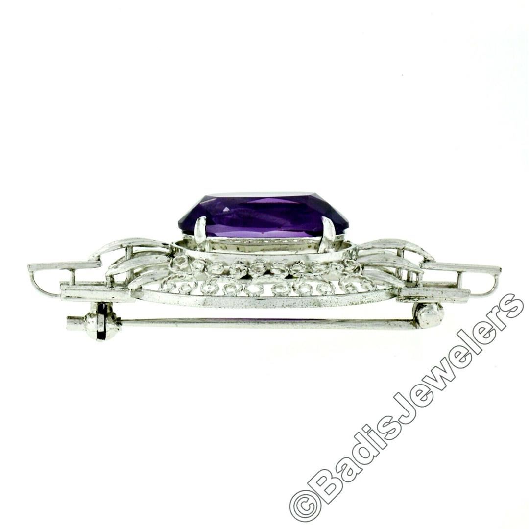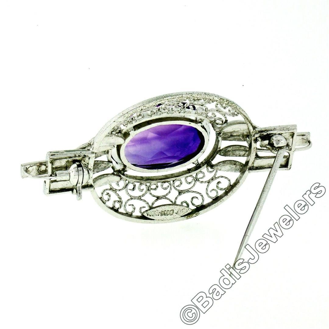A vintage 10kt white gold brooch featuring an oval cut amethyst (10.53ct) prong set at its center. Measures 24.10x48.45mm and weighs a total of 8.14 grams.