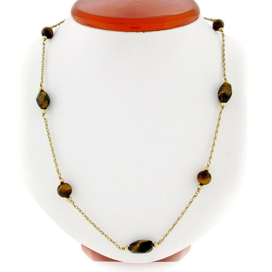 A vintage 10kt yellow gold necklace featuring 11 natural tiger's eye beads - 5 round (8.0mm) and 6 faceted custom cut (12.0x7.0mm). 26.5 inch chain, 14.33 grams total weight.