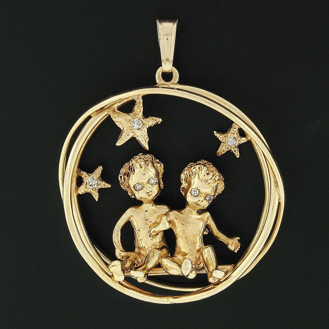 A vintage solid 14k yellow gold 3D gemini zodiac sign charm pendant, with 7 old single & round brilliant cut natural diamonds (E/F - VS1/VS2 ; 0.18ctw). The pendant weighs a total of 24.96 grams, measures 50.4x38mm including the bail, and the inside of the bail measures 8.5x5.9mm.