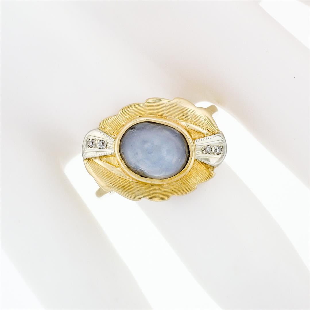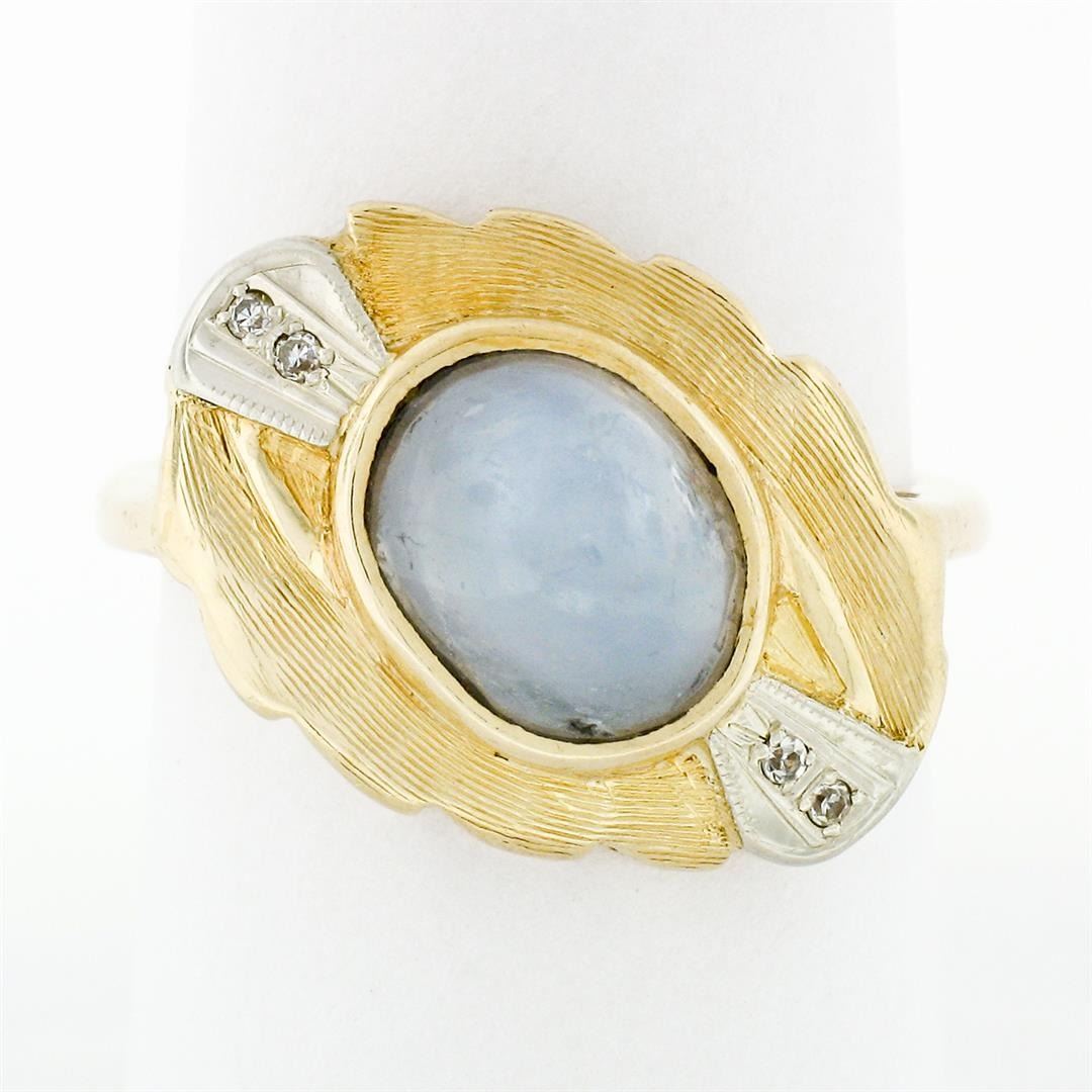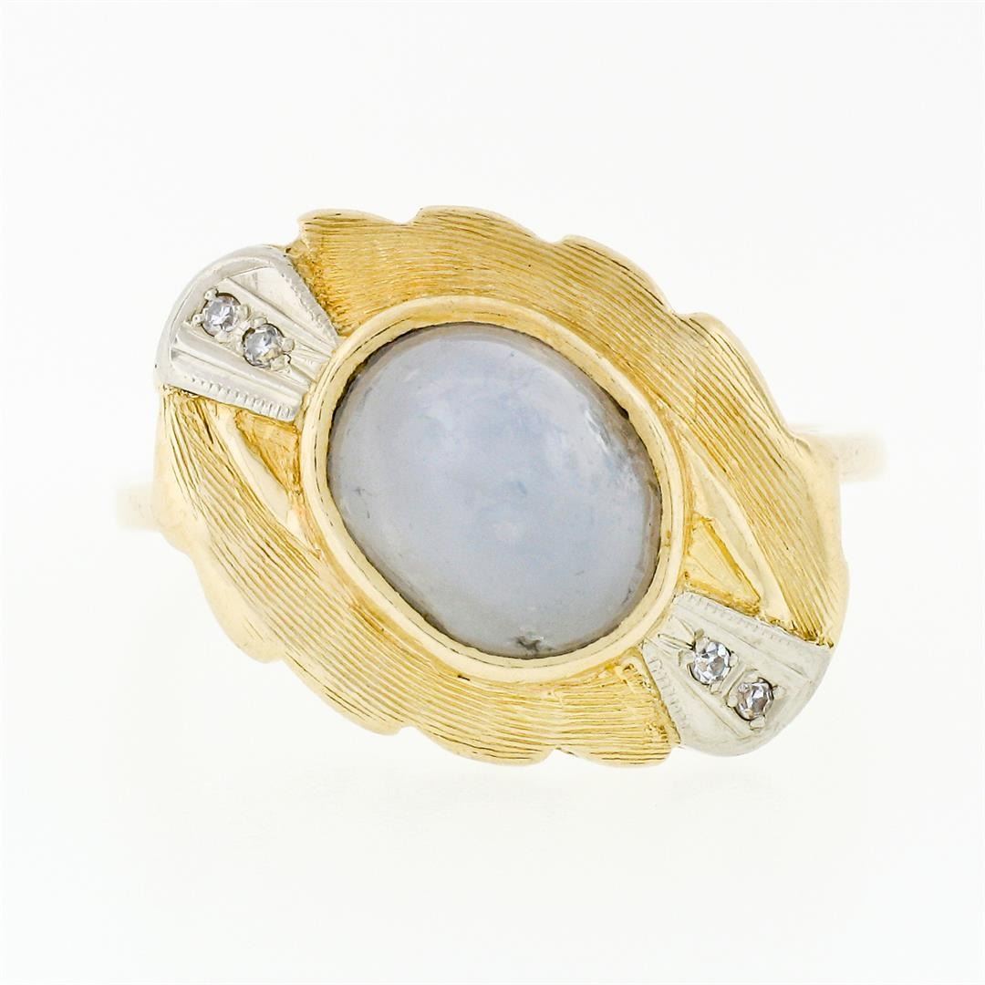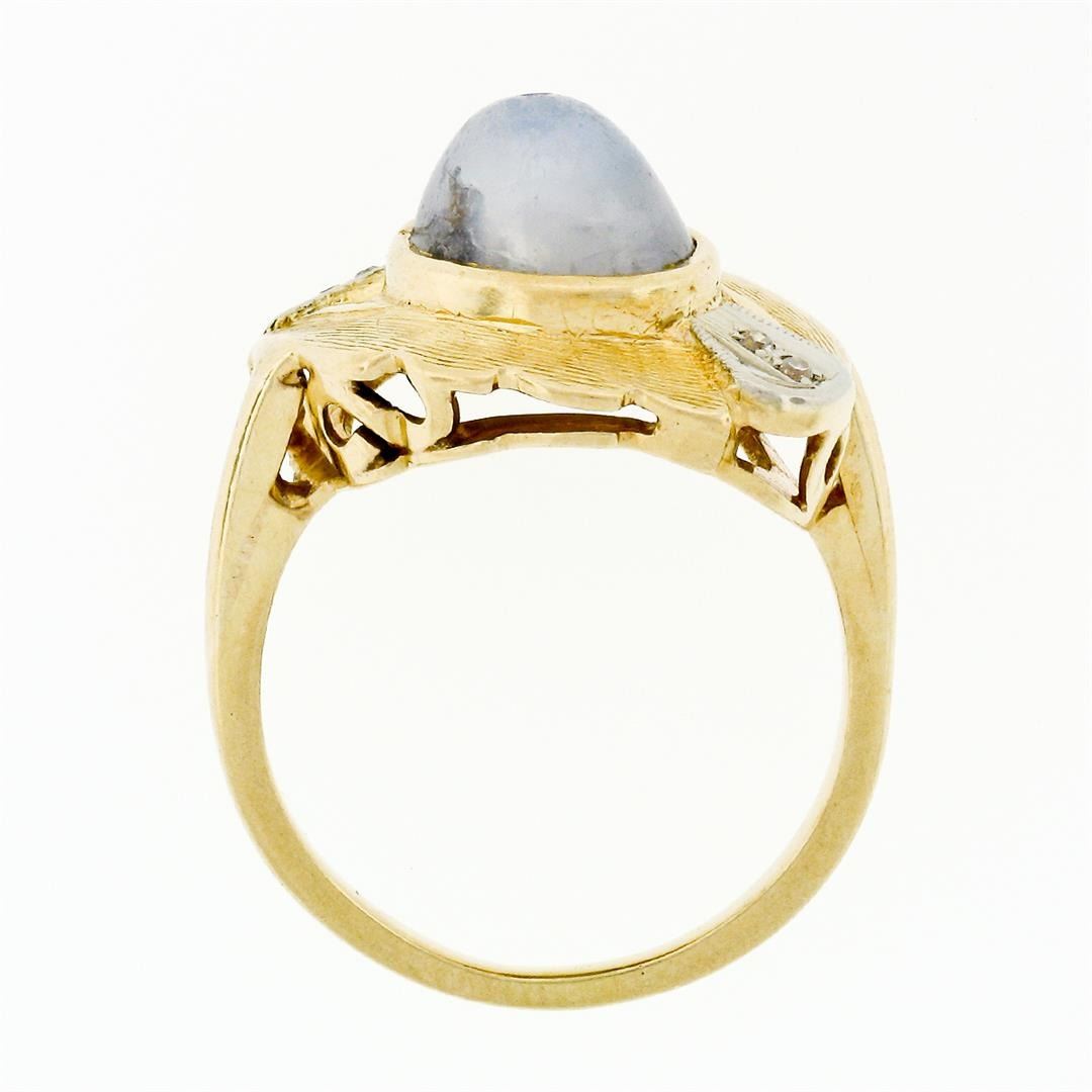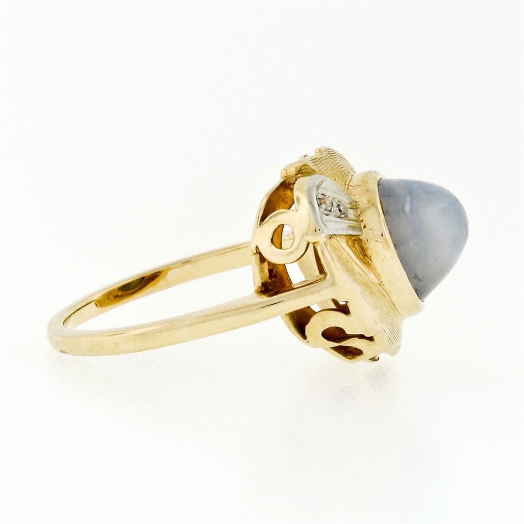 A vintage two tone solid 14k gold cocktail ring with a natural gray star sapphire (9.4x7.45mm; 6.81ct) accented by 4 old single cut natural diamonds (G/H - VS1/VS2; 0.04ctw). The ring is size 8.0, weighs a total of 7.25 grams, and measures 15.5mm wide.