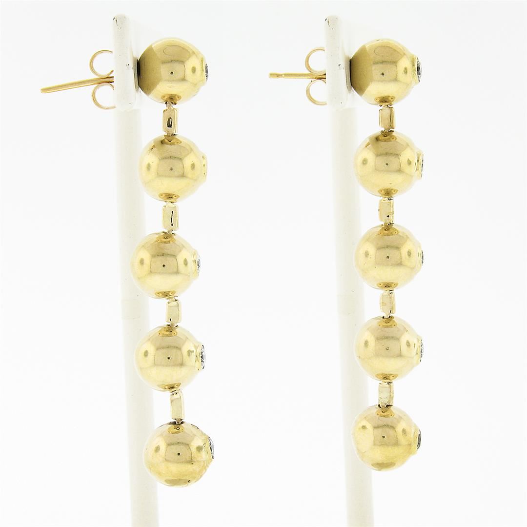 A pain of solid 14k yellow gold long drop earrings, with 10 round brilliant cut natural diamonds (G/H - SI1/SI2 ; 0.60ctw). The earrings measure approximately 48.30x7.2mm and weigh a total of 11.67 grams.