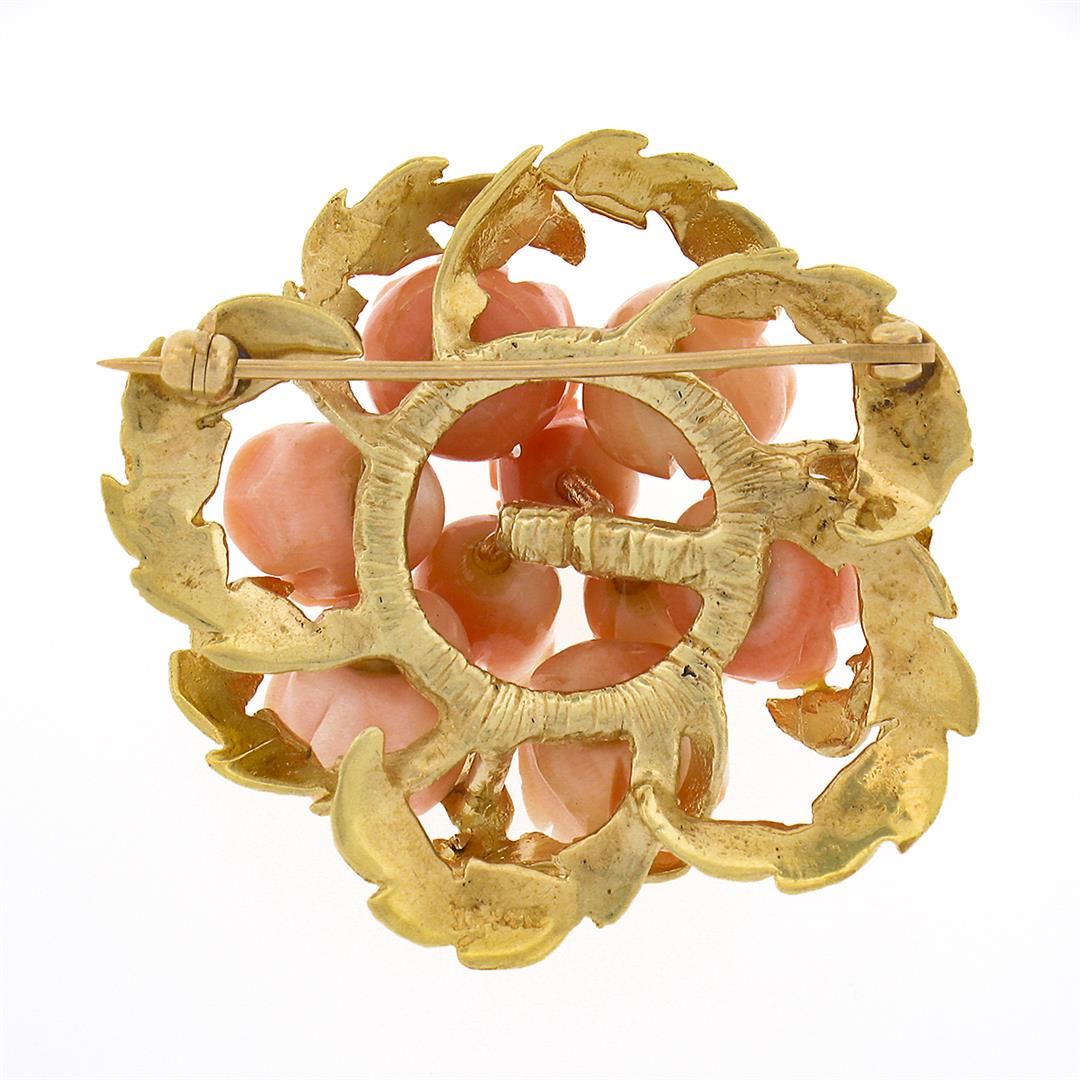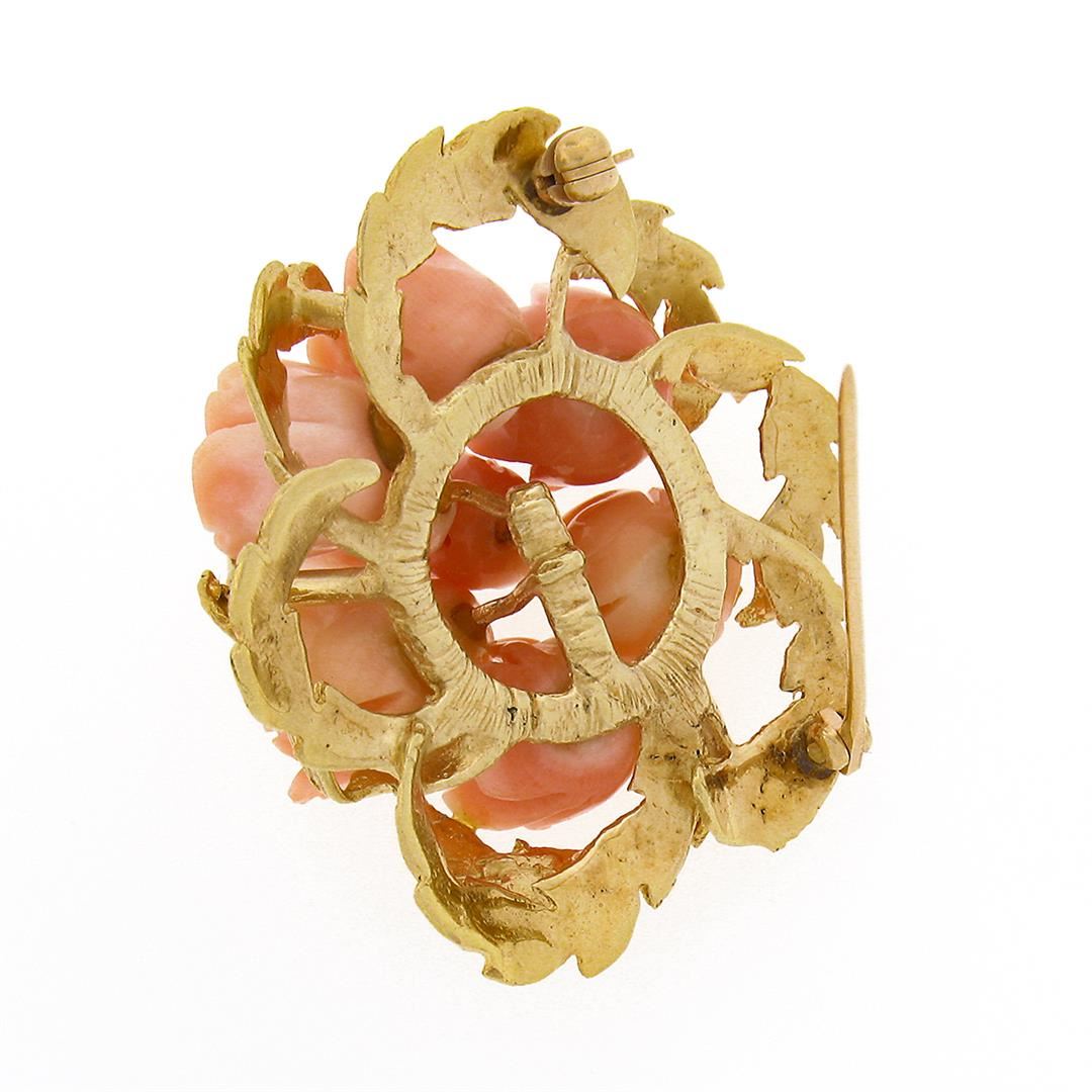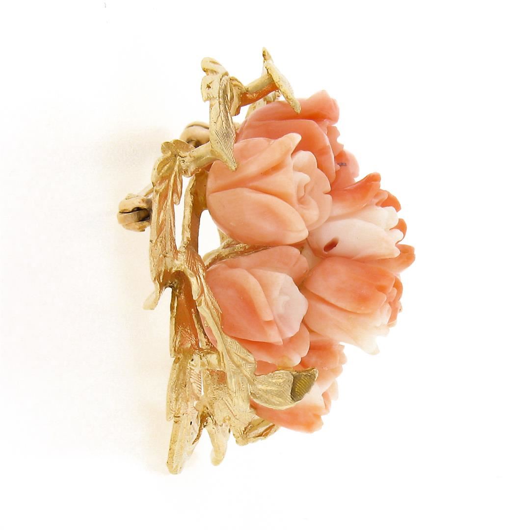 A solid 14k yellow gold flower bouquet pin brooch, with 9 carved rose shape natural corals (9.3x9.0mm). Measures 35.30x36.50mm and weighs a total of 15.90 grams.