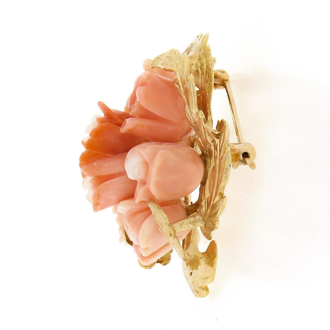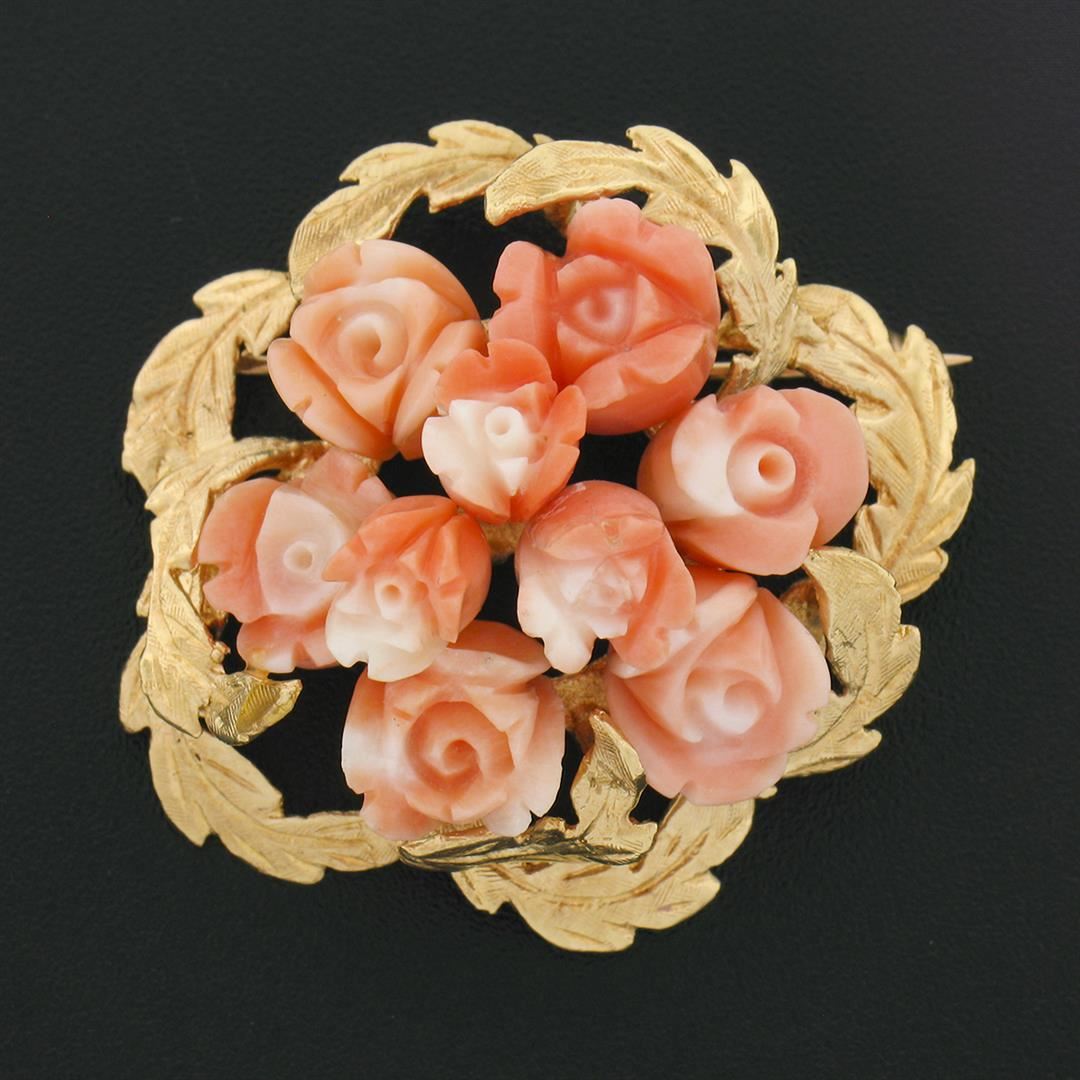 A solid 14k yellow gold flower bouquet pin brooch, with 9 carved rose shape natural corals (9.3x9.0mm). Measures 35.30x36.50mm and weighs a total of 15.90 grams.