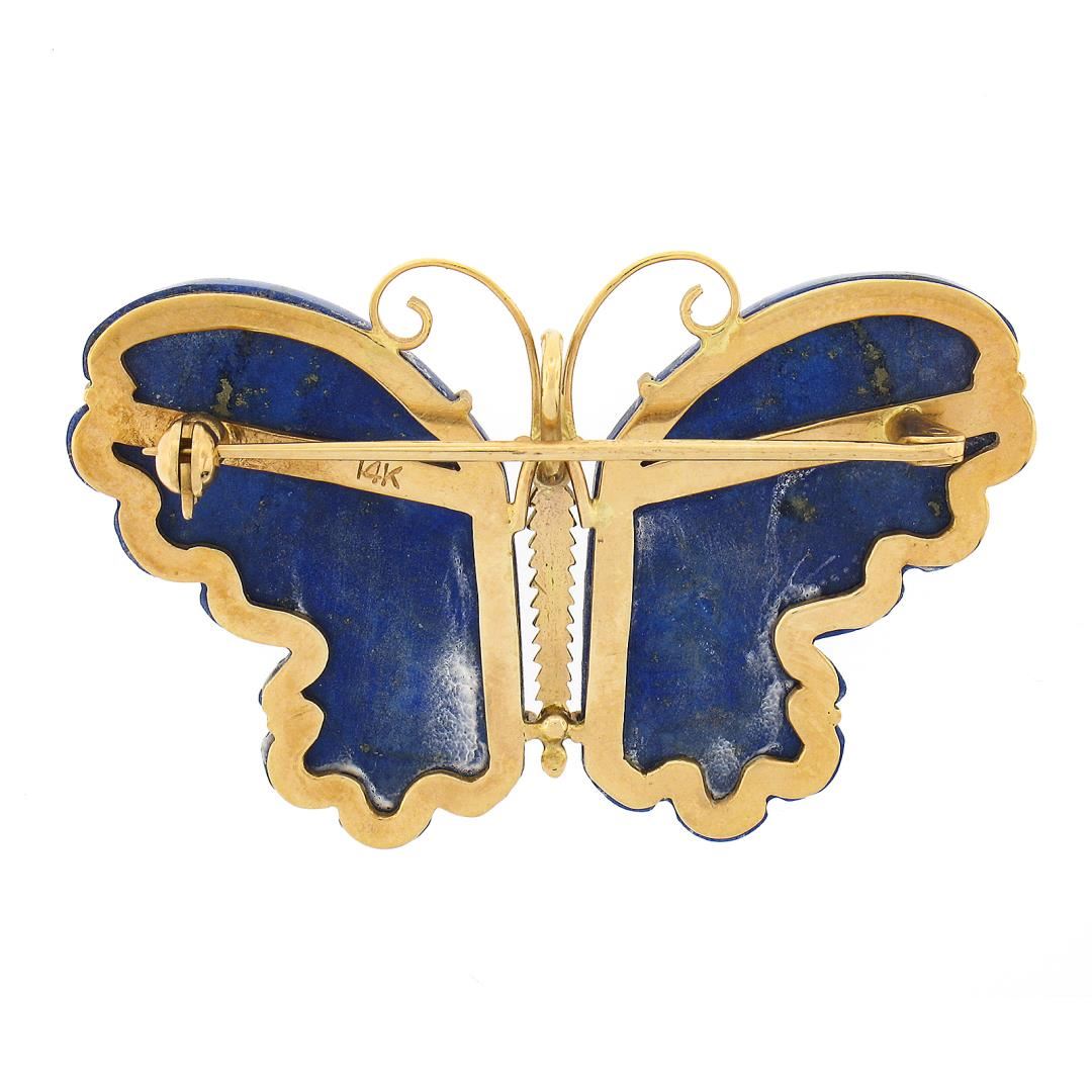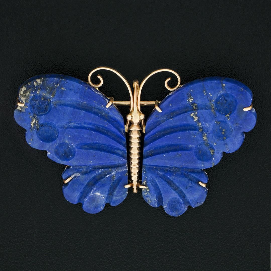 A vintage solid 14k yellow gold brooch pendant, with 2 custom cut carved natural lapis lazuli (30x22.3mm each). Measures 30.5x48.4mm and weighs a total of 11.75 grams.
