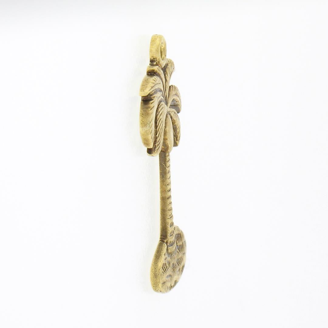 A vintage solid 14k yellow gold palm tree charm pendant. The pendant weighs a total of 0.80 grams, measures 19x9.3mm, and needs a jumpring bail.