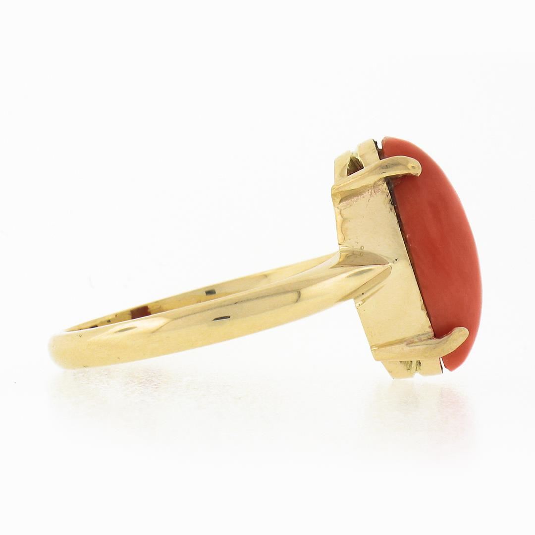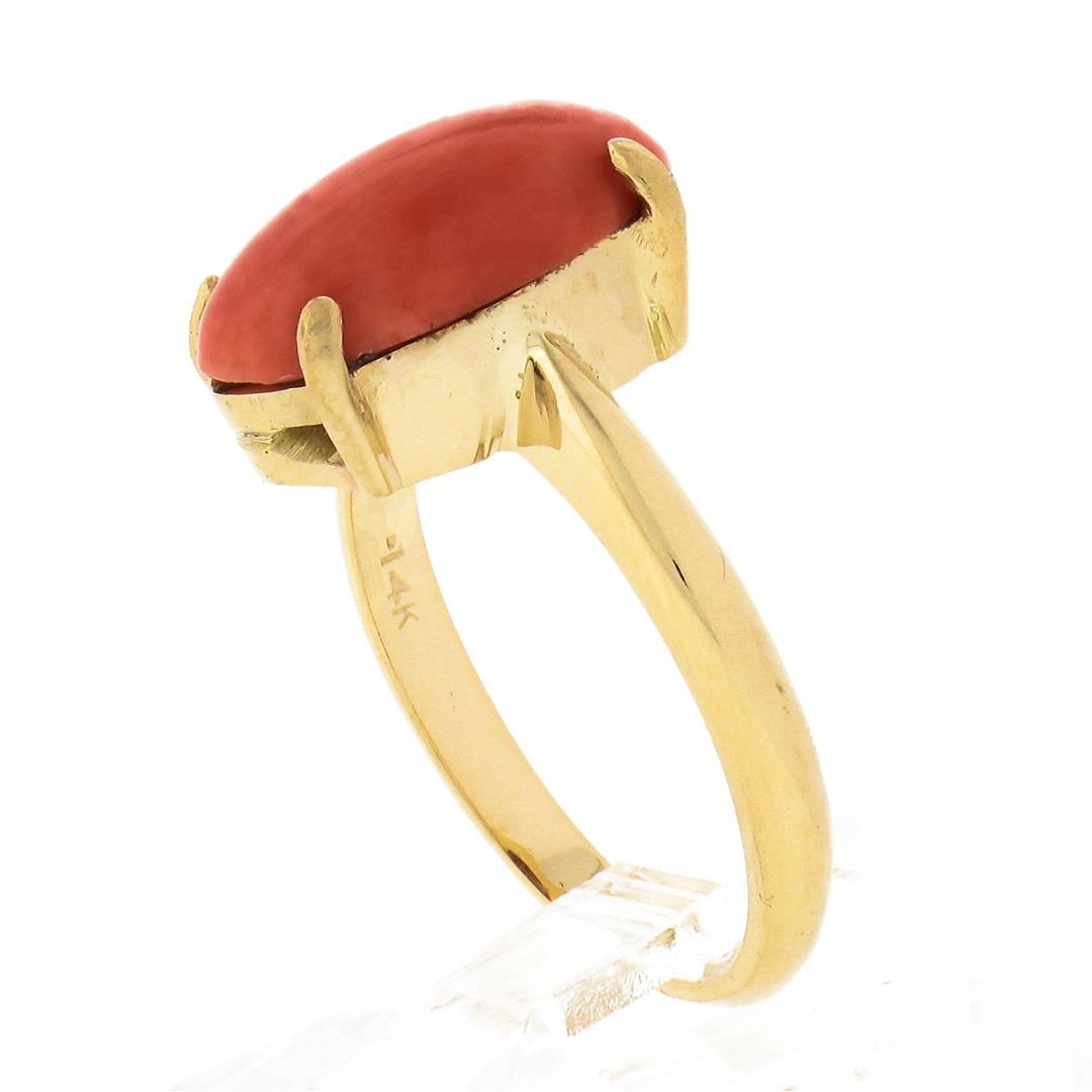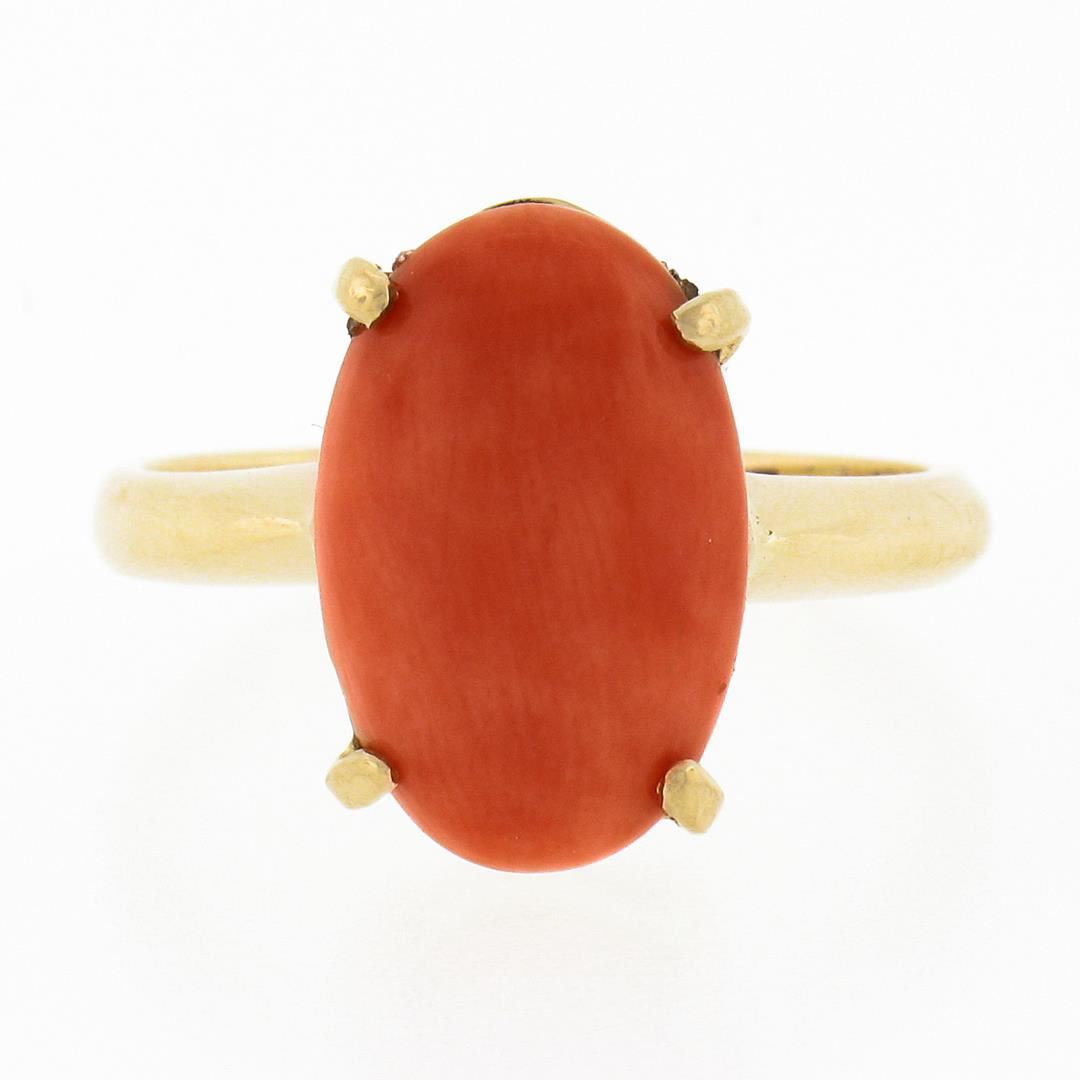 A vintage solid 14k yellow gold solitaire ring, with 1 oval cabochon cut aural coral (14.2x9.3mm). The ring is size 7.0, weighs a total of 4.32 grams, and measures 14.3mm wide.