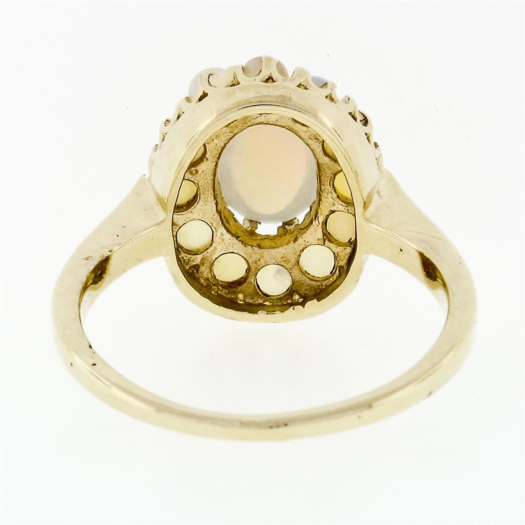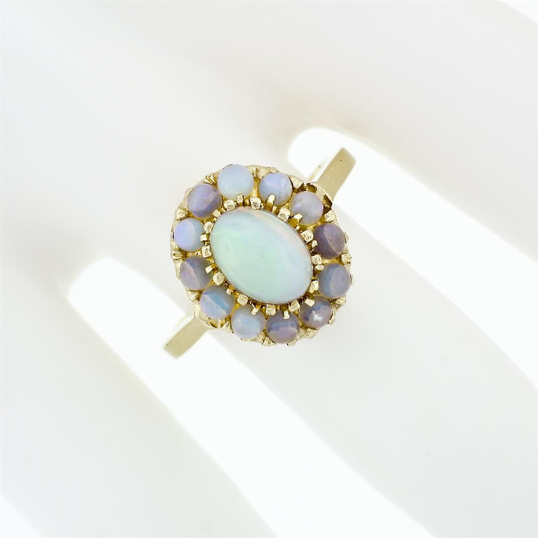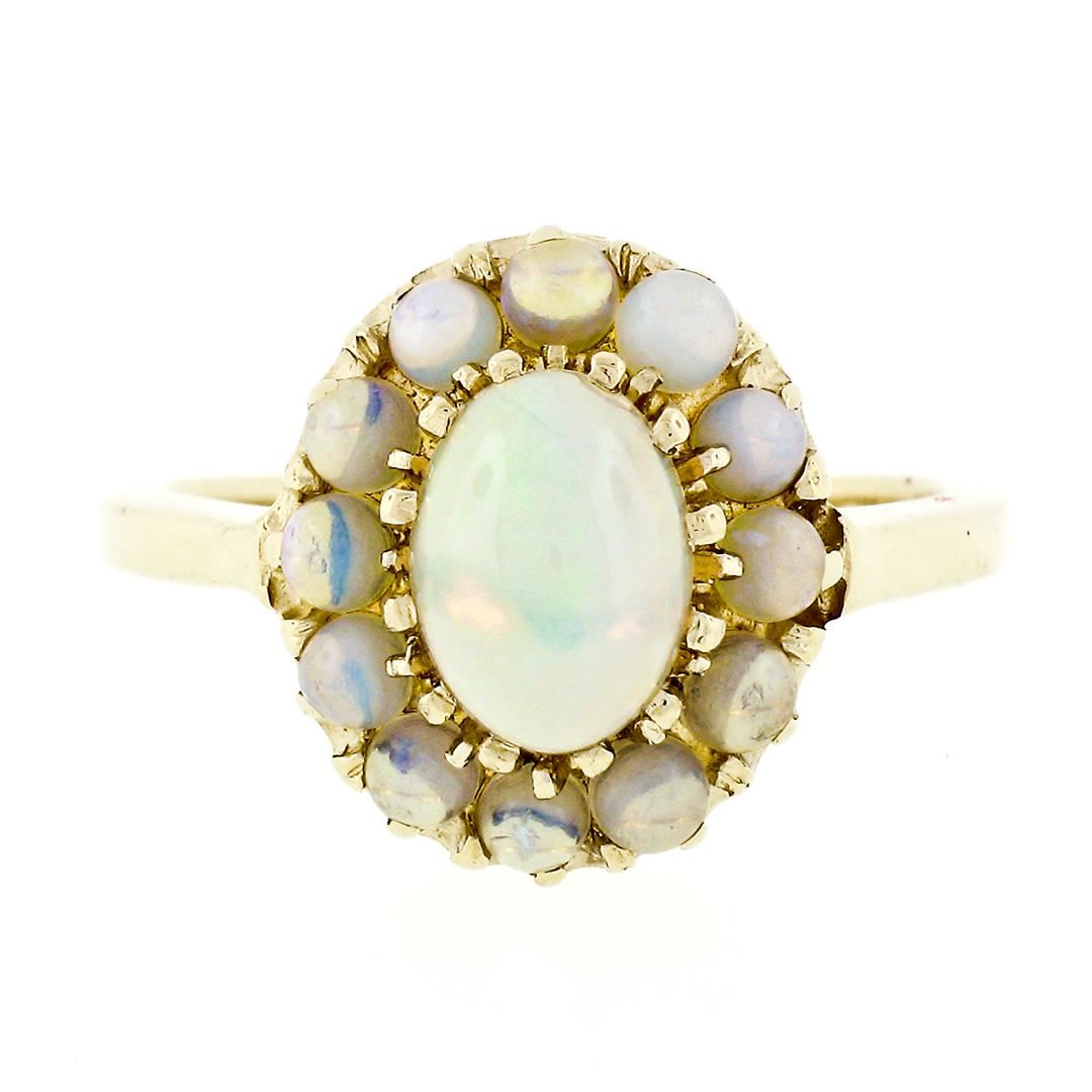 A solid 14k yellow gold cluster ring, with 1 oval cabochon cut natural opal (8.15x6mm), surrounded with a halo of 12 round ball shape natural opals (2.25mm to 2.5mm). The ring is size 7.0, weighs a total of 4.07 grams, and measures 11.9mm wide.