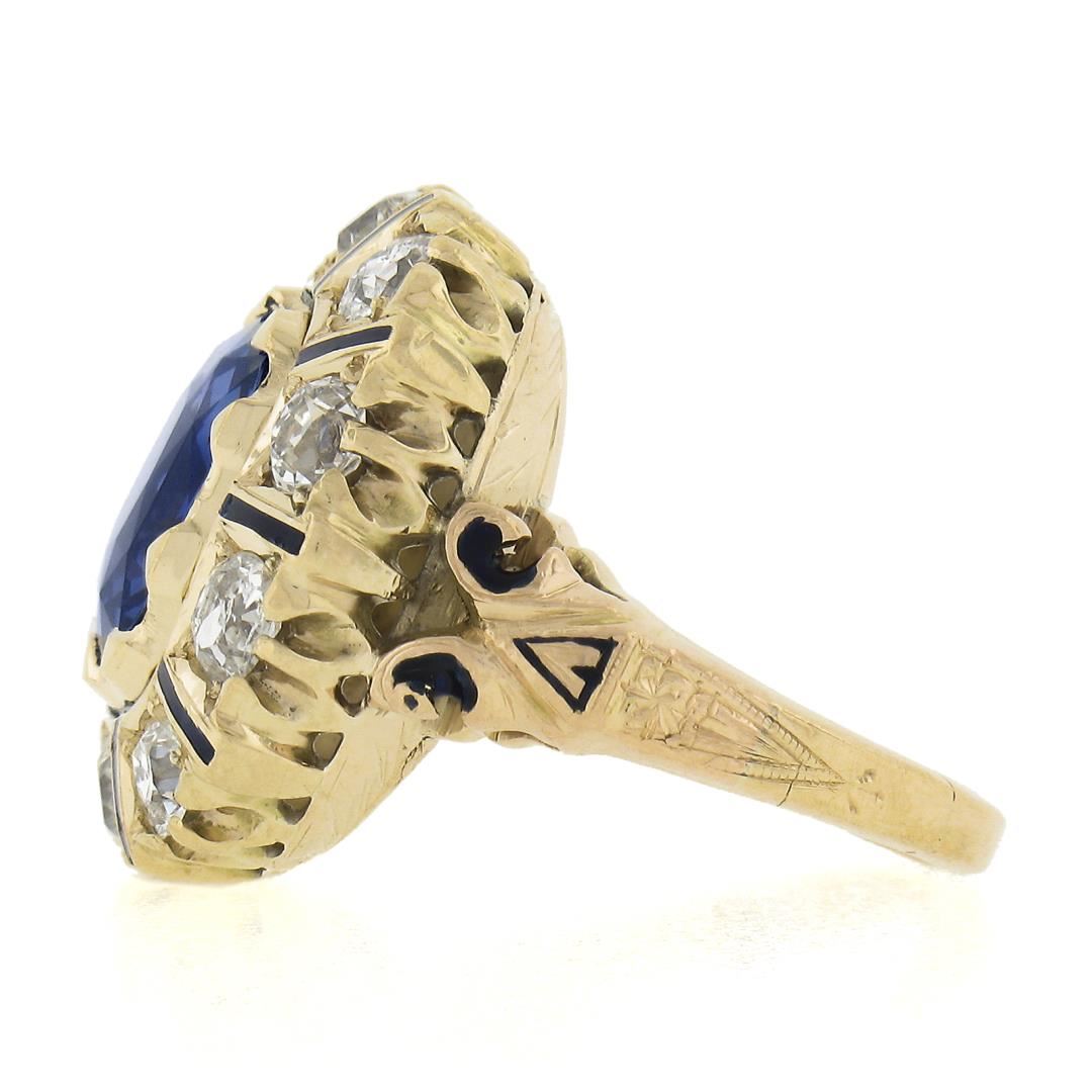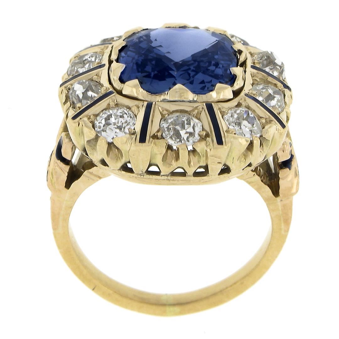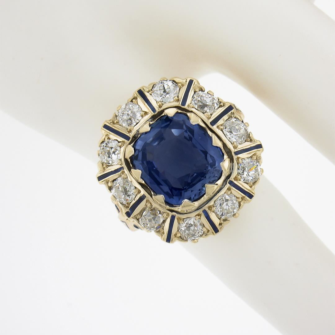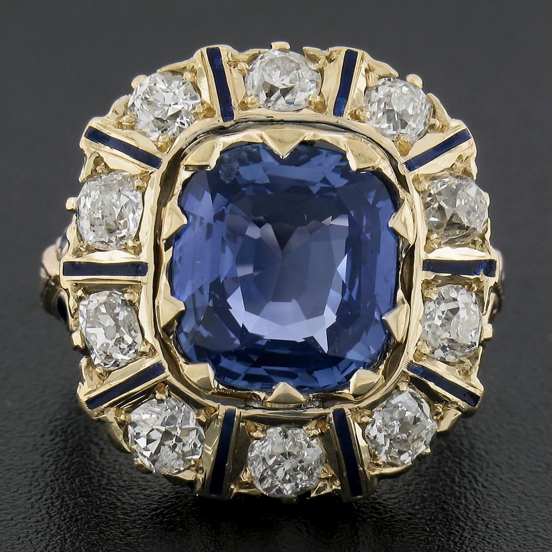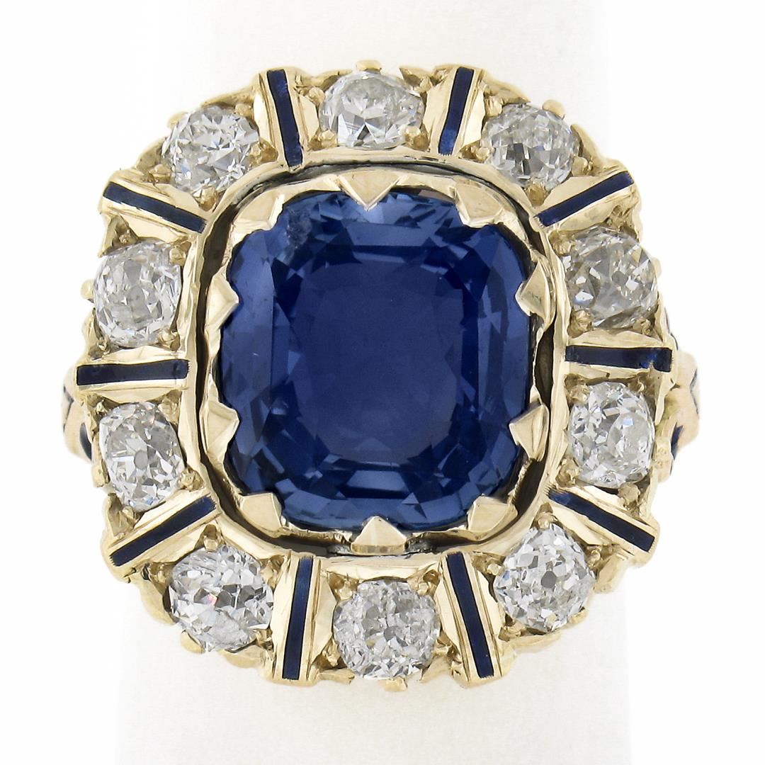 A vintage solid 14k yellow gold ring, with 1 GIA graded cushion cut natural sapphire (5.04ct), and 10 old mine cut natural diamonds (H-J - VS2-I2 ; 1.40ctw). The ring is size 5.5, weighs a total of 8.95 grams, and measures 19.8mm wide. Comes with all original relevant certifications.