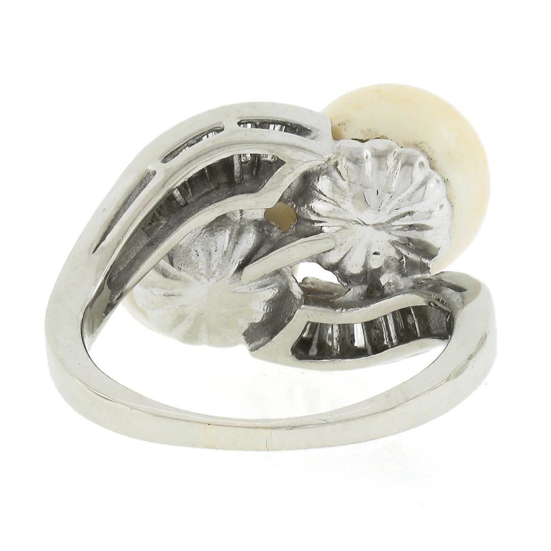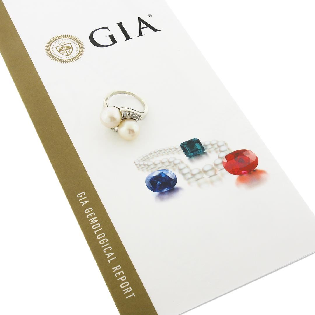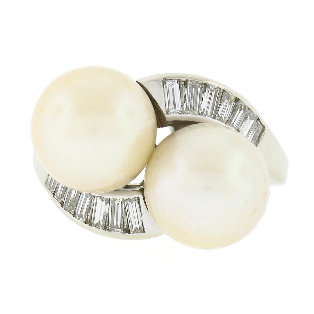 A vintage 14k white gold bypass ring, with 2 GIA graded cultured saltwater akoya pearls (9.90 & 9.82mm), with 14 baguette cut natural diamonds (G/H - VS1/VS2 ; 0.40ctw). The ring is size 6.5, weighs a total of 7.25 grams, and measures 13.2mm wide. Comes with all original relevant certifications.