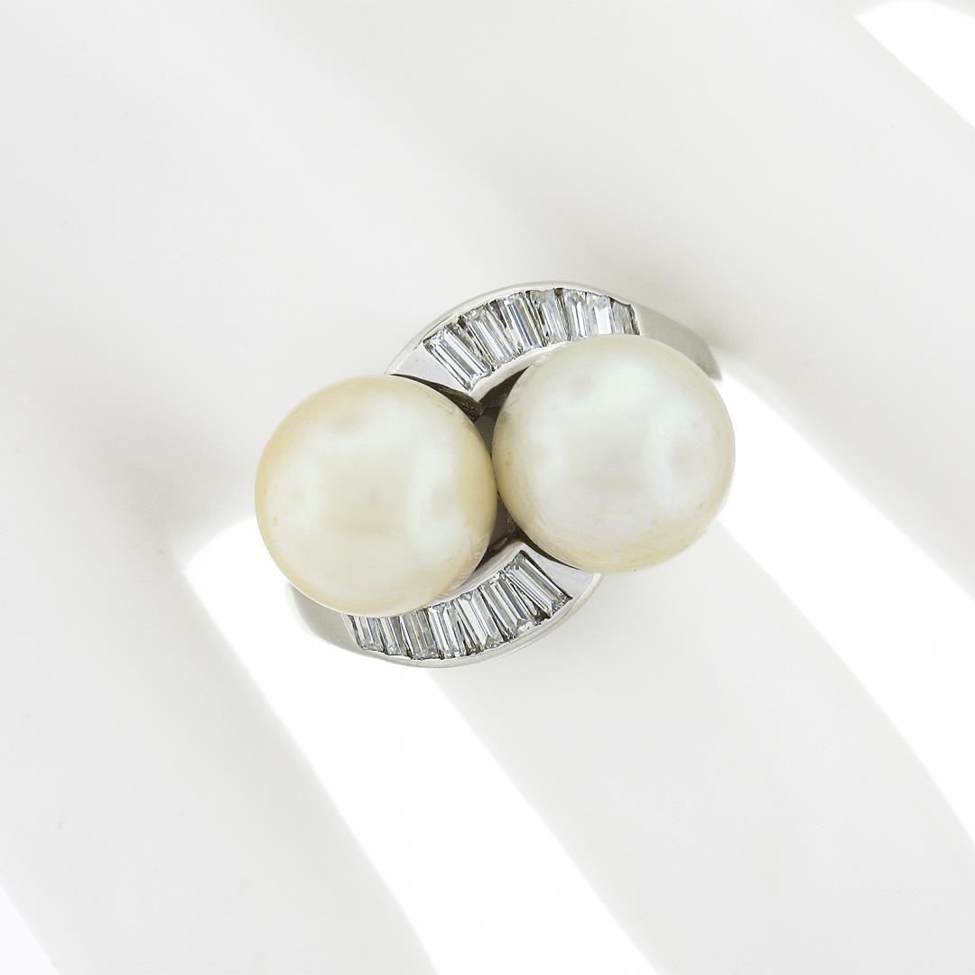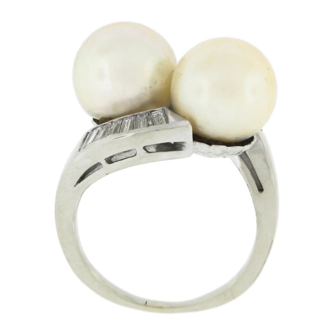 A vintage 14k white gold bypass ring, with 2 GIA graded cultured saltwater akoya pearls (9.90 & 9.82mm), with 14 baguette cut natural diamonds (G/H - VS1/VS2 ; 0.40ctw). The ring is size 6.5, weighs a total of 7.25 grams, and measures 13.2mm wide. Comes with all original relevant certifications.