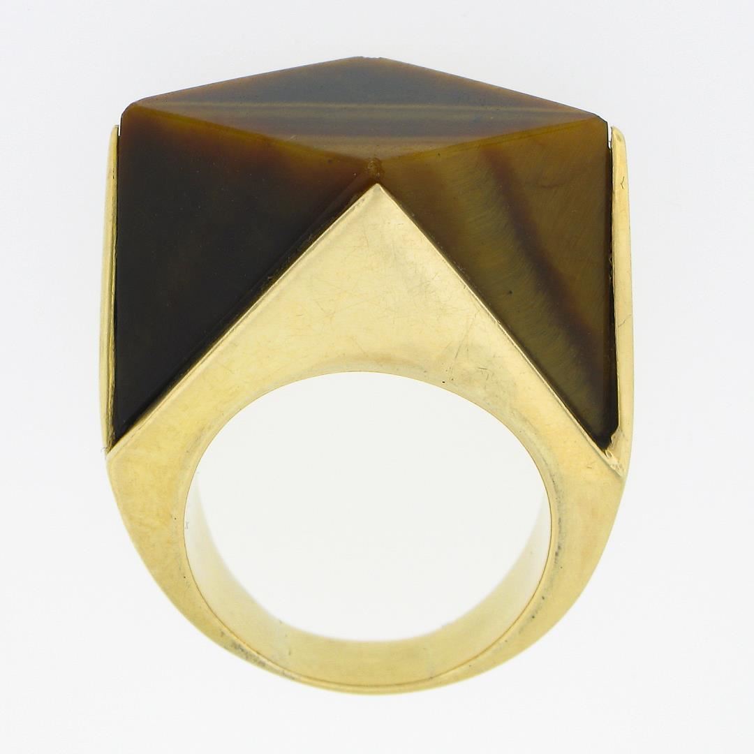 A vintage solid 14k yellow gold geometric ring, featuring a custom cut natrual genuine tiger's eye (23.7x14.9mm). The ring is size 6.5, weighs a total of 17.14 grams, and measures 16.20mm wide.