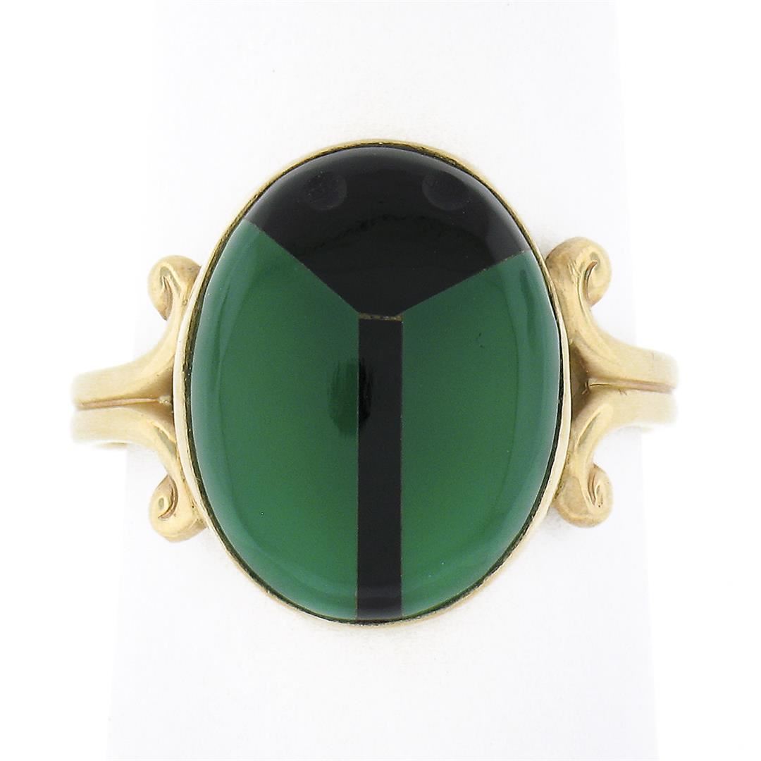 A solid 14k yellow gold scarav beetle ring, with inlaid set 2 natural chrysoprase and 2 natural black onyx. The ring is size 7.5, weighs a total of 4.12 grams, and measures 15.60mm wide.