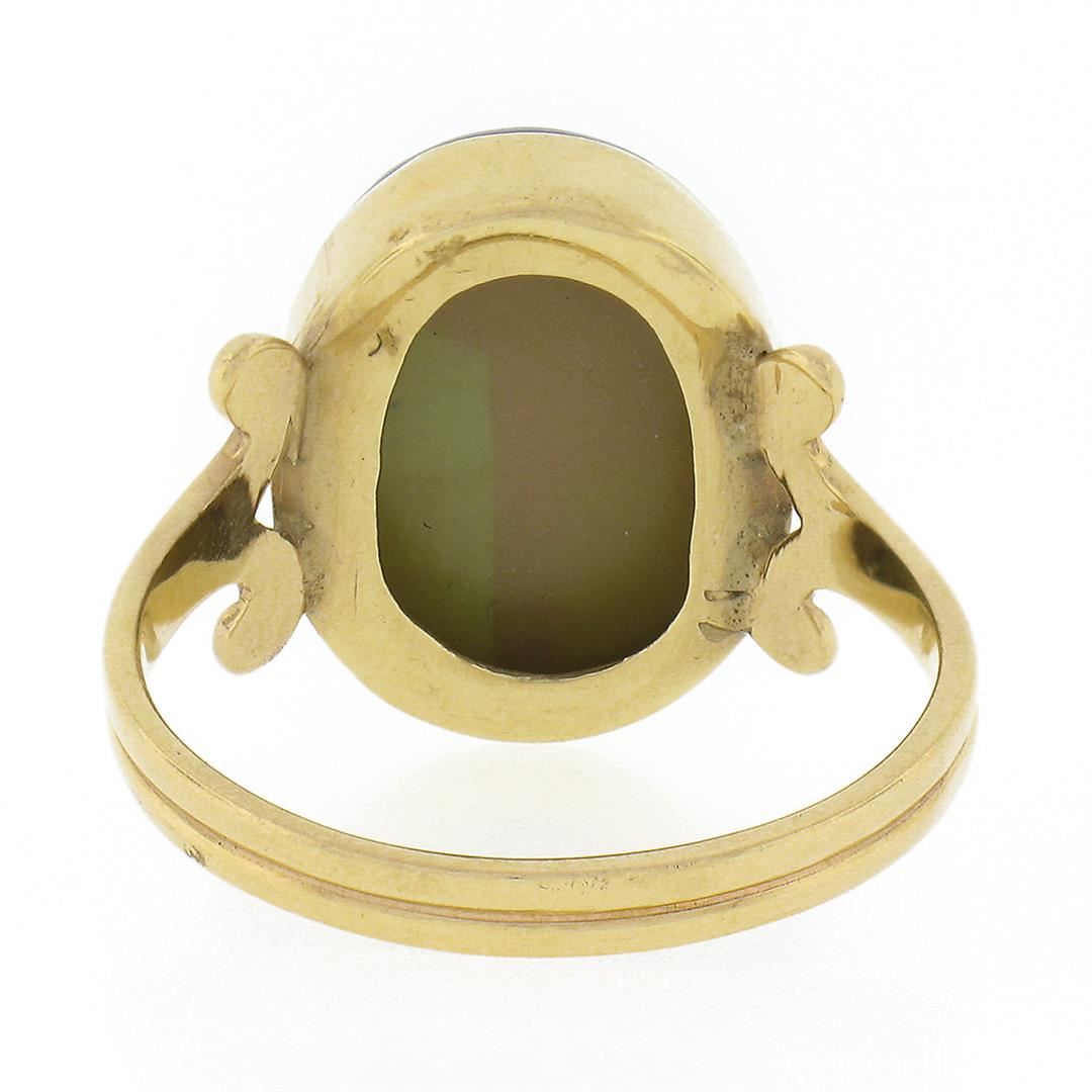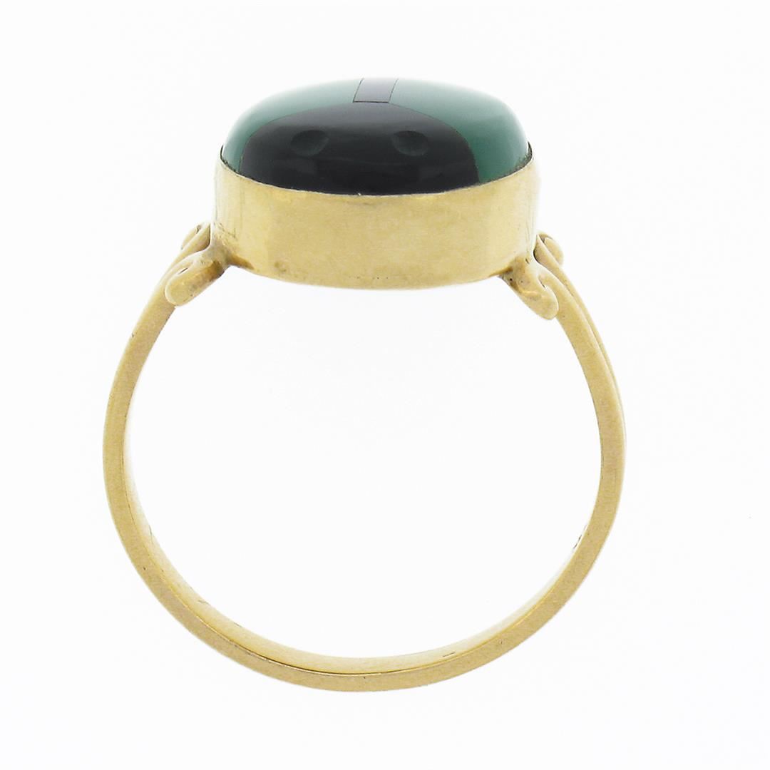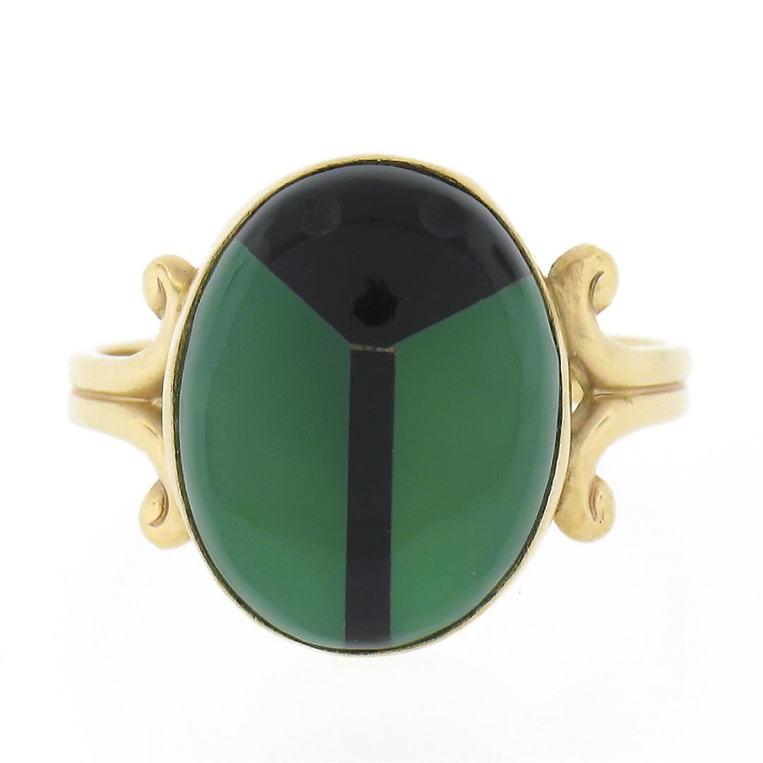 A solid 14k yellow gold scarav beetle ring, with inlaid set 2 natural chrysoprase and 2 natural black onyx. The ring is size 7.5, weighs a total of 4.12 grams, and measures 15.60mm wide.