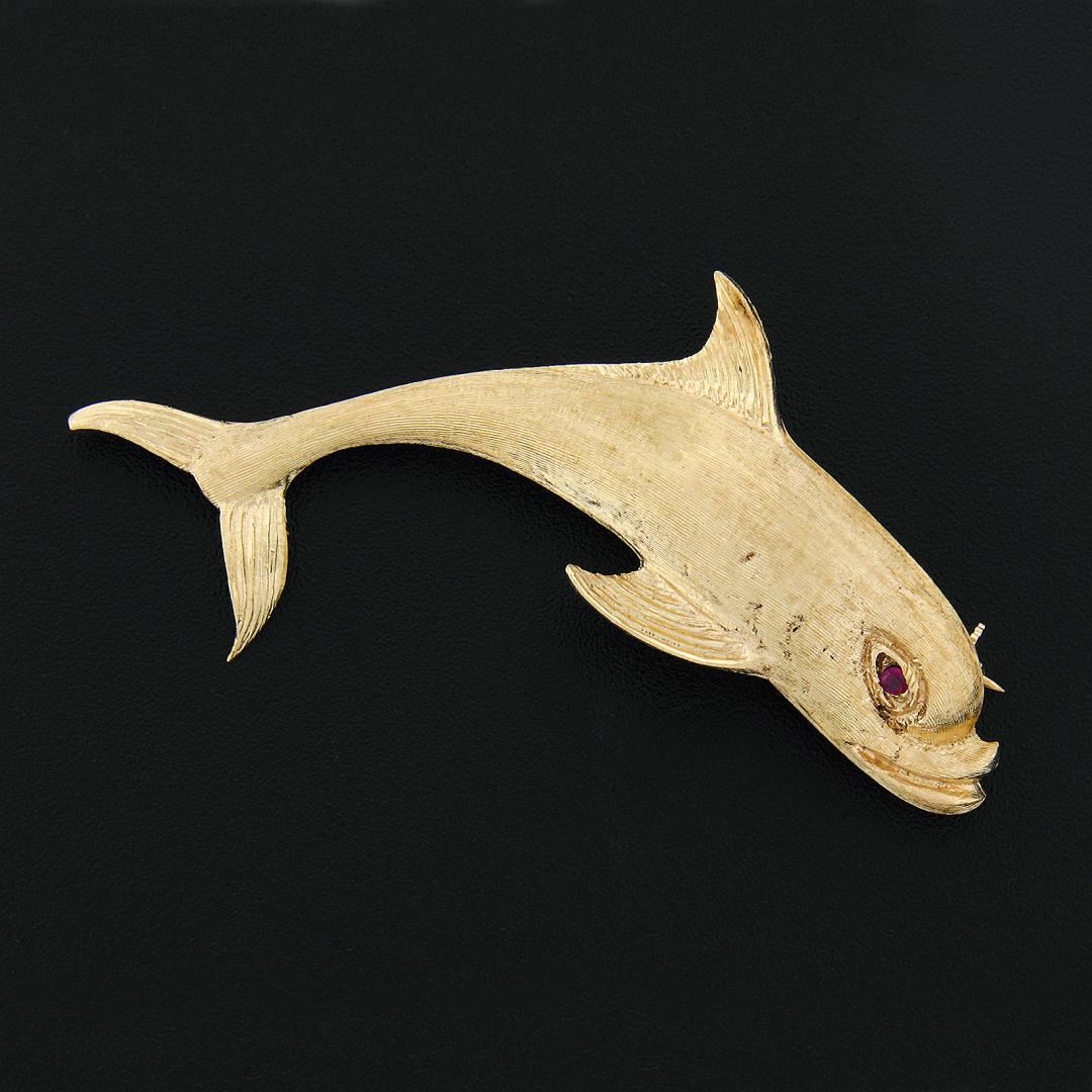 a vintage solid 14k yellow gold diving fish brooch, with 1 round brilliant cut natural ruby (0.03ct). Measures 21.80x59.80mm and weighs a total of 12.73 grams.