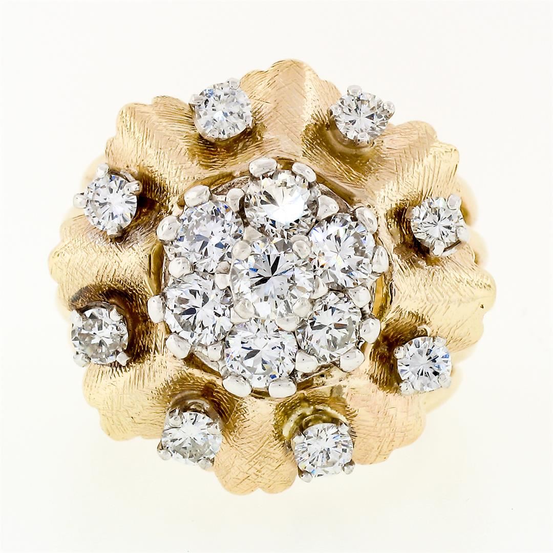 A vintage solid 14k two tone gold cluster flower ring , with 15 round brilliant cut natural diamonds (F/G - VS1-SI1; 1.67 ctw). The ring is size 6.5, weighs a total of 10.80 grams, and measures 20.9mm wide.