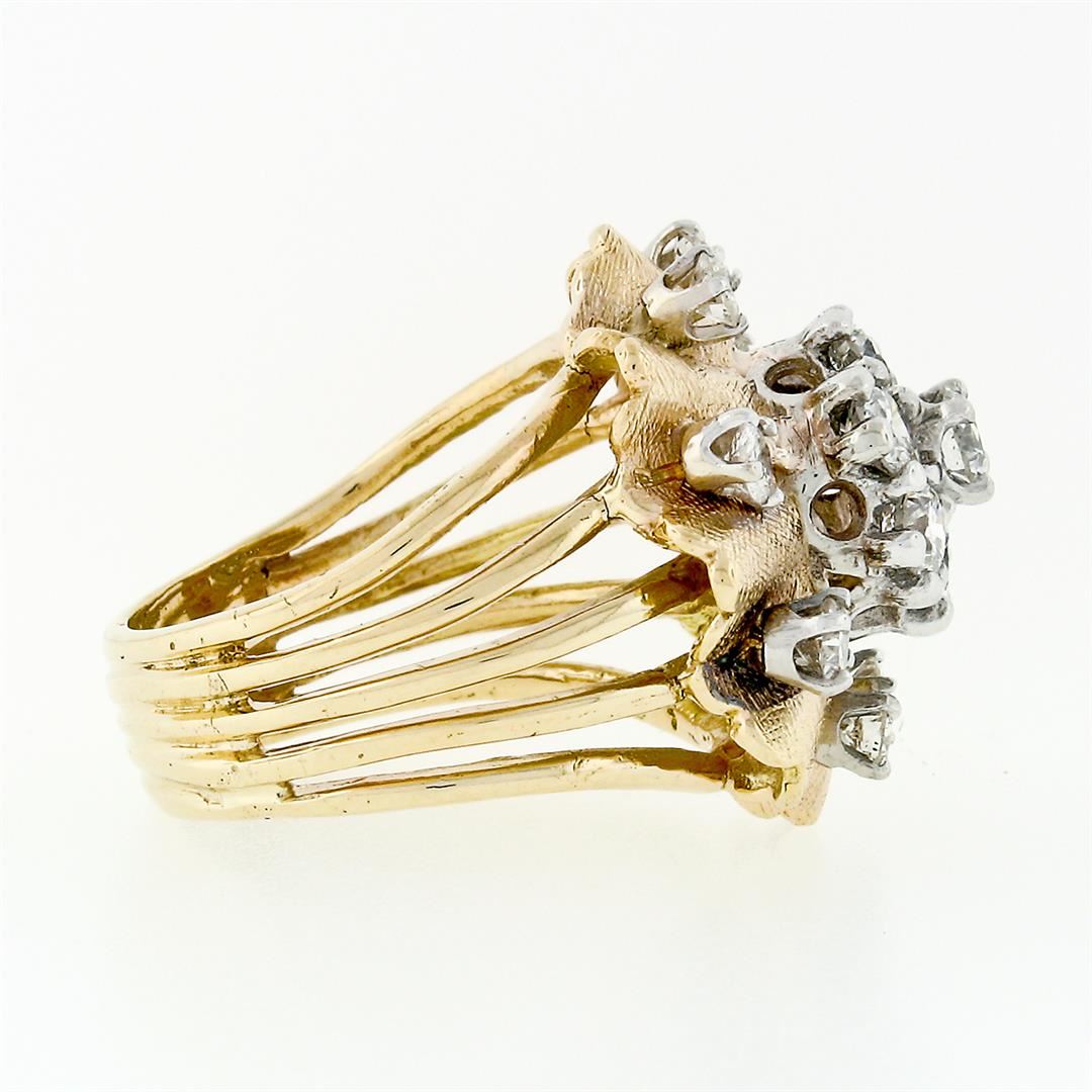 A vintage solid 14k two tone gold cluster flower ring , with 15 round brilliant cut natural diamonds (F/G - VS1-SI1; 1.67 ctw). The ring is size 6.5, weighs a total of 10.80 grams, and measures 20.9mm wide.