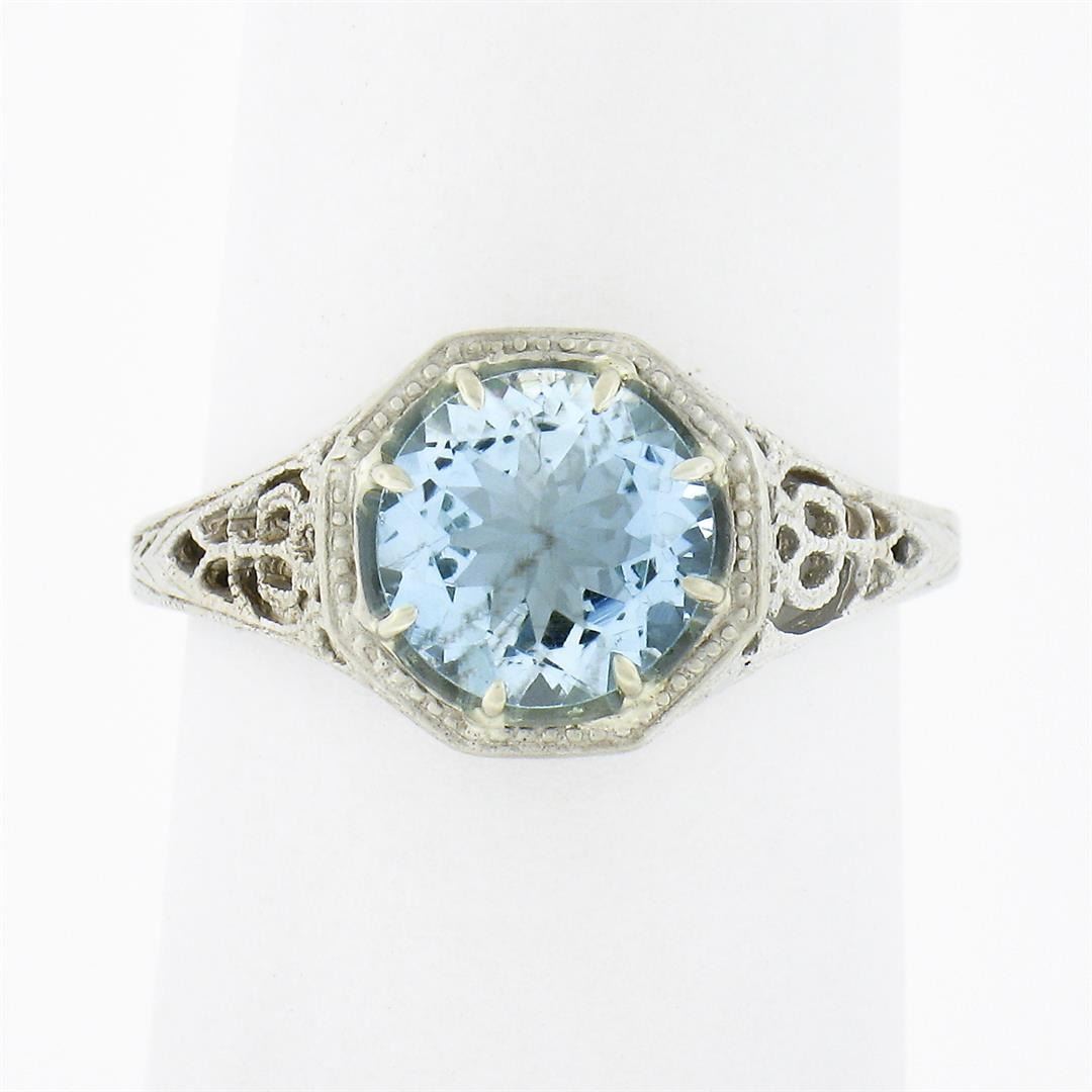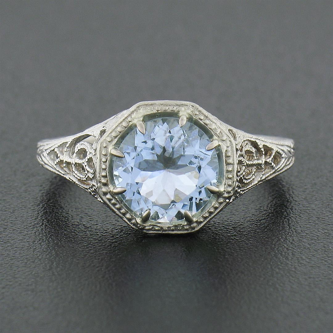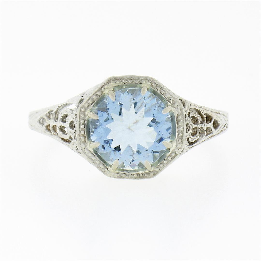 A vintage solid 14k white gold solitaire ring, with 1 round cut natural aquamarine (1.32ct). The ring is size 6.0, weighs a total of 2.23 grams, and measures 9.55mm wide.