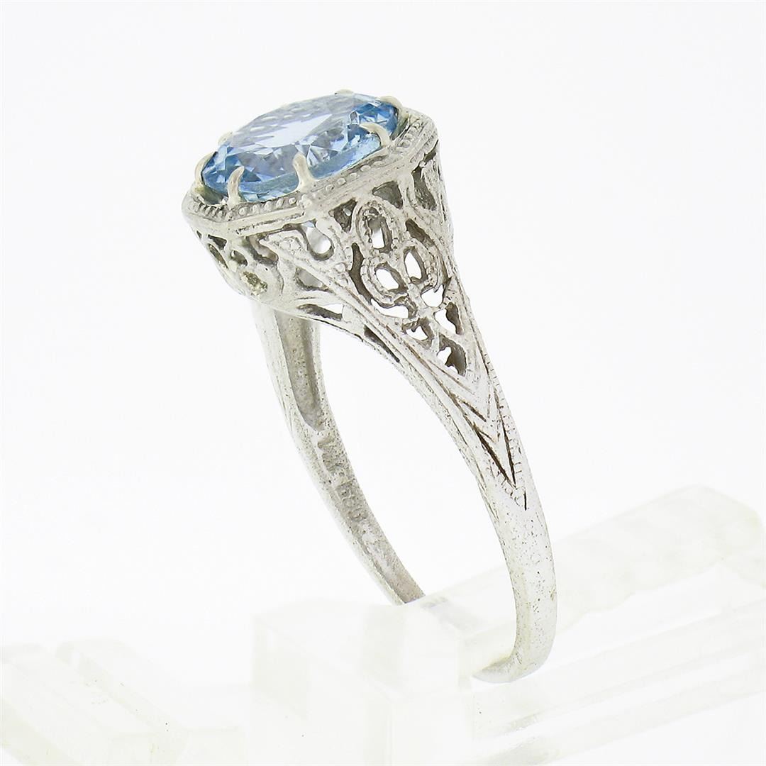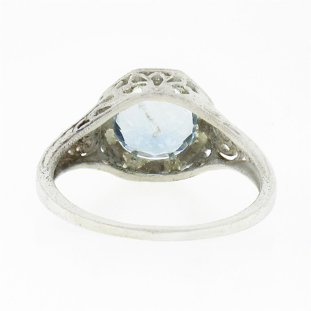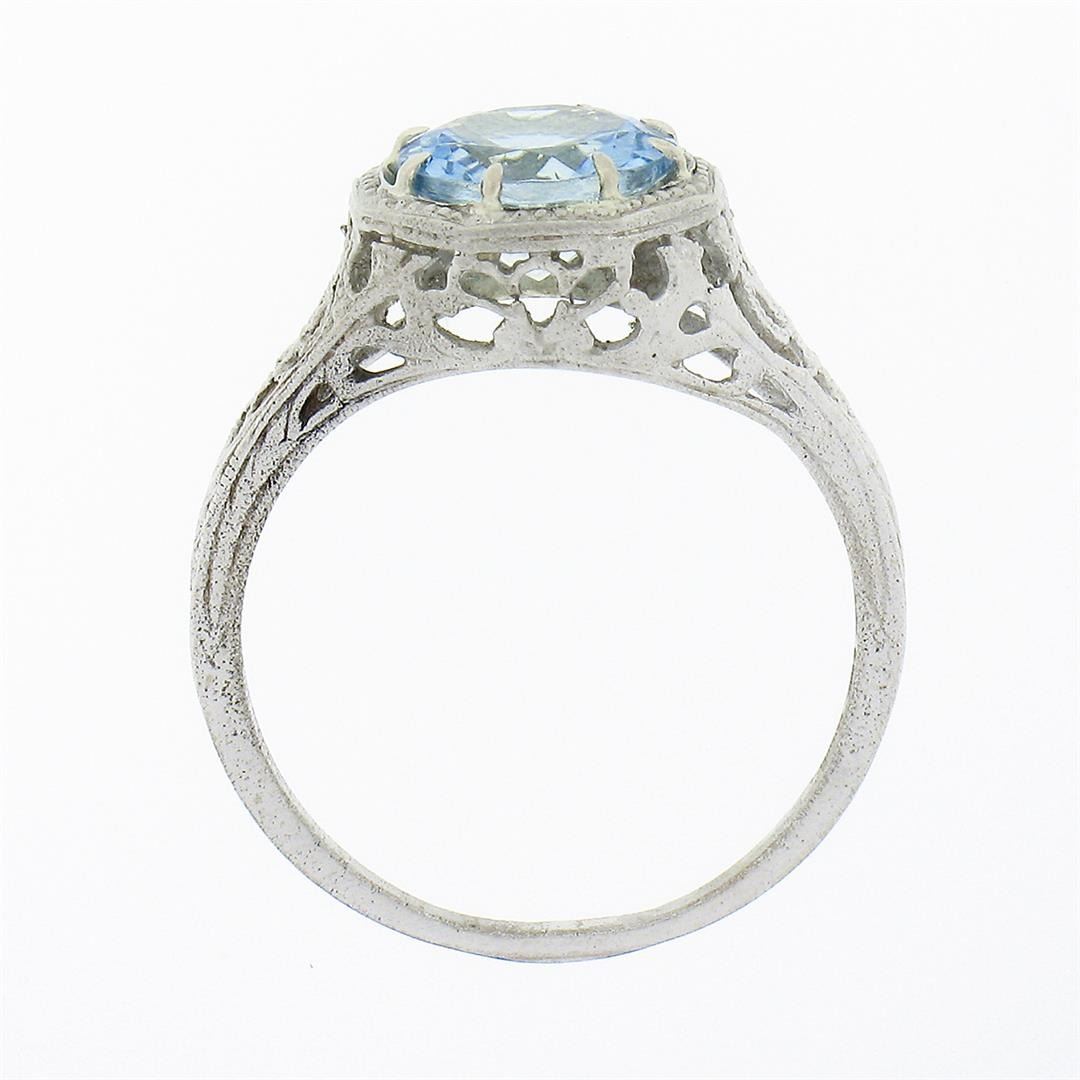 A vintage solid 14k white gold solitaire ring, with 1 round cut natural aquamarine (1.32ct). The ring is size 6.0, weighs a total of 2.23 grams, and measures 9.55mm wide.