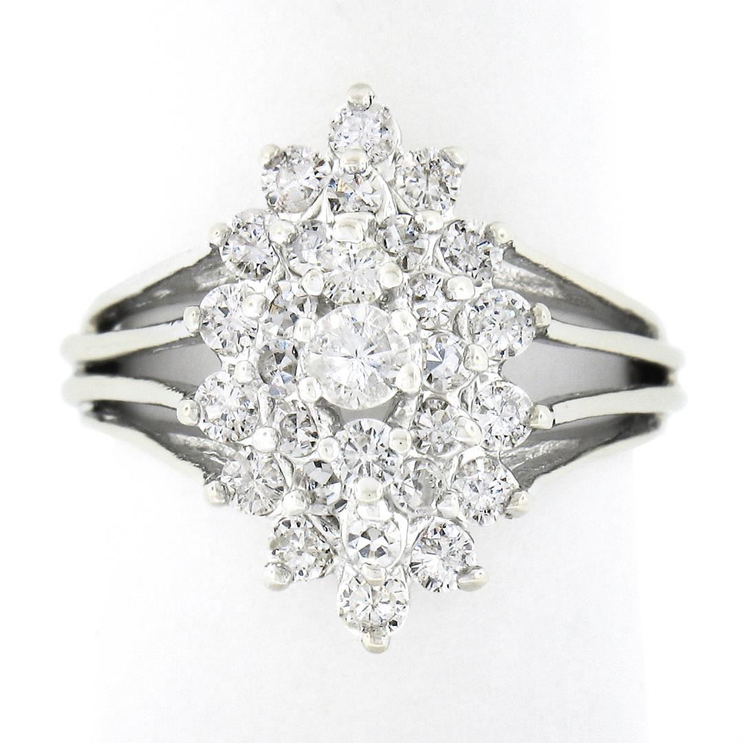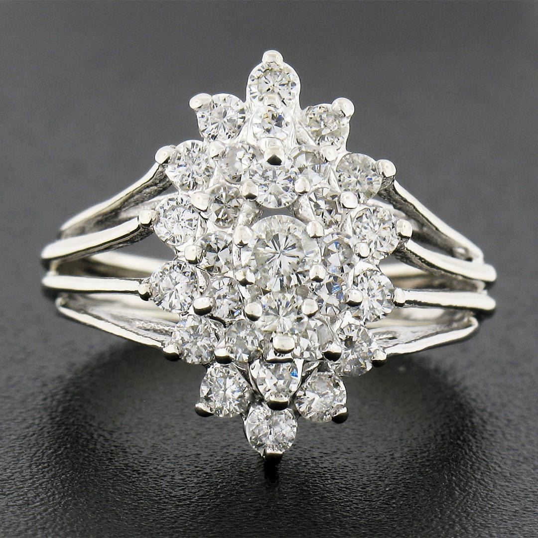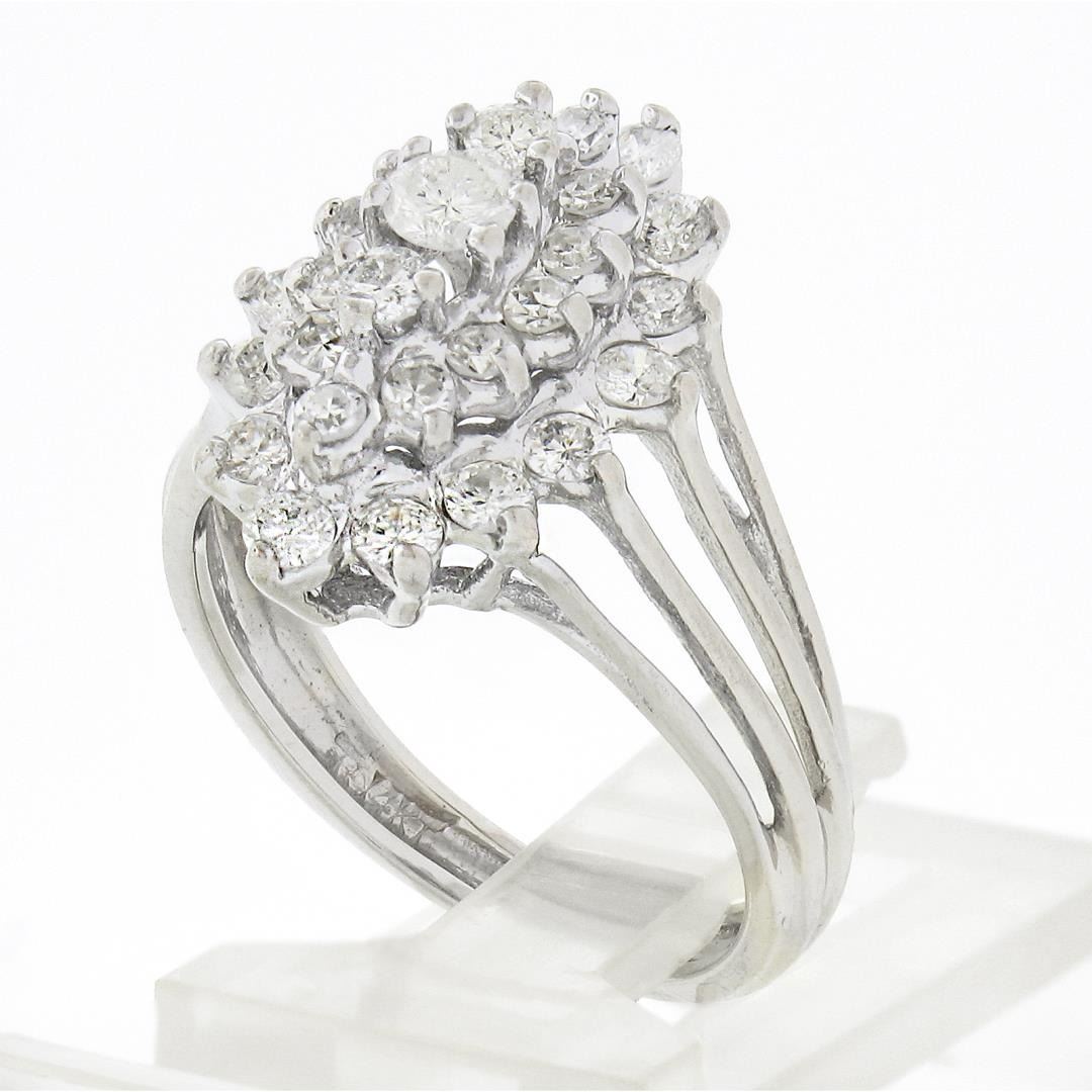 A vintage solid 14k white gold ring, with 29 single & round brilliant cut natural diamonds (F/G - SI1/SI2 ; 1.35ct). The ring is size 6.5, weighs a total of 4.42 grams, and measures 17.60mm wide.