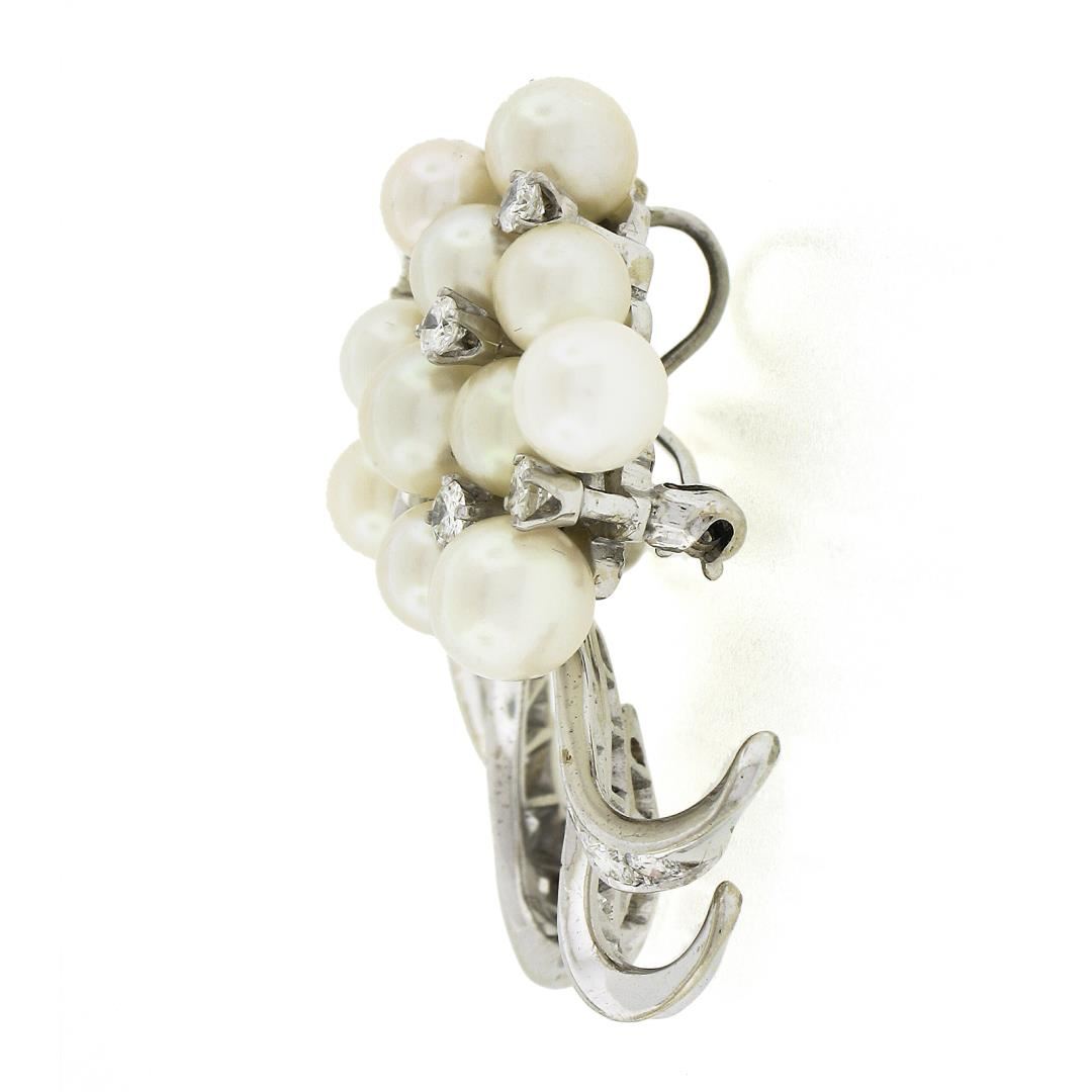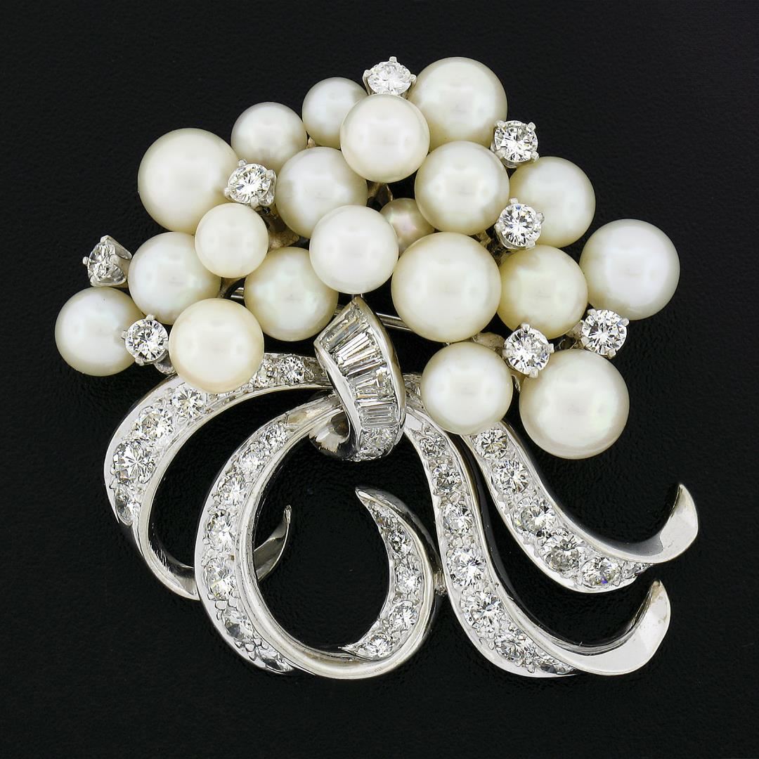 A vintage solid 14k white gold brooch pendant, with 20 round shape cultured pearls (4.0-6.55mm each), accented with 44 round brilliant cut & 4 tapered baguette cut natural diamonds (G-I - VS1-VS2 w/ a few SI1 ; 1.90ctw). Measures 37.6x37.7mm and weighs a total of 16.43 grams, inside bail measurements 6.1x4.4mm.