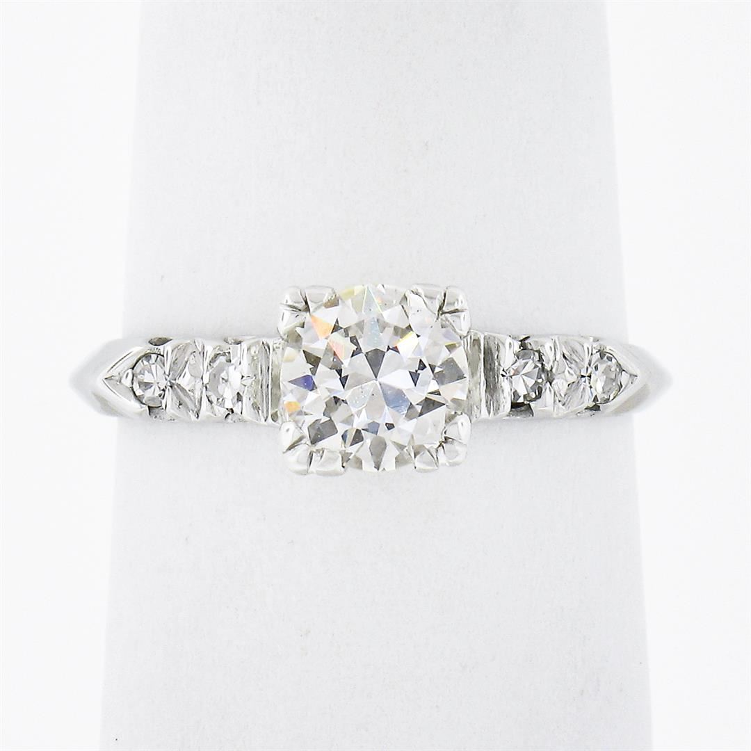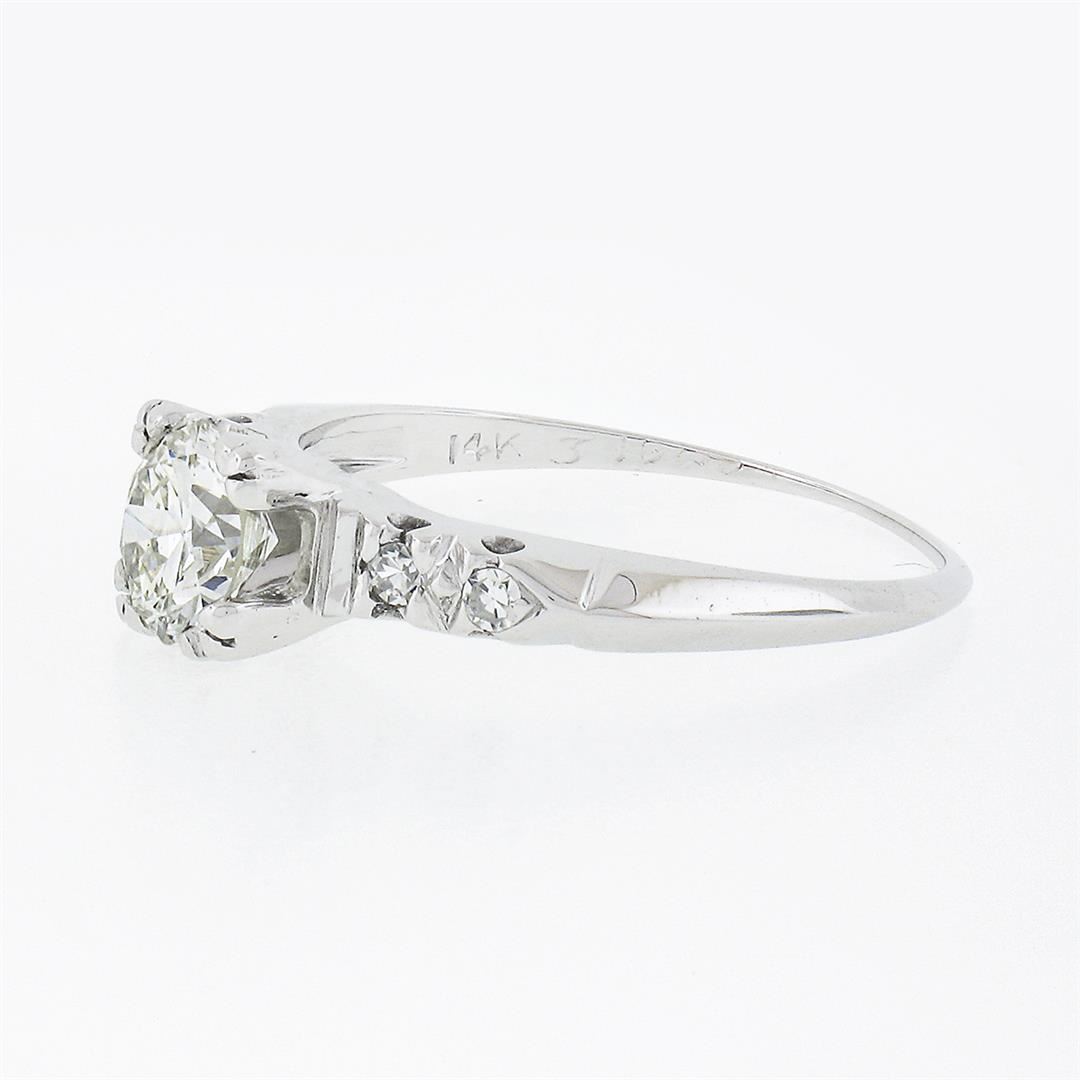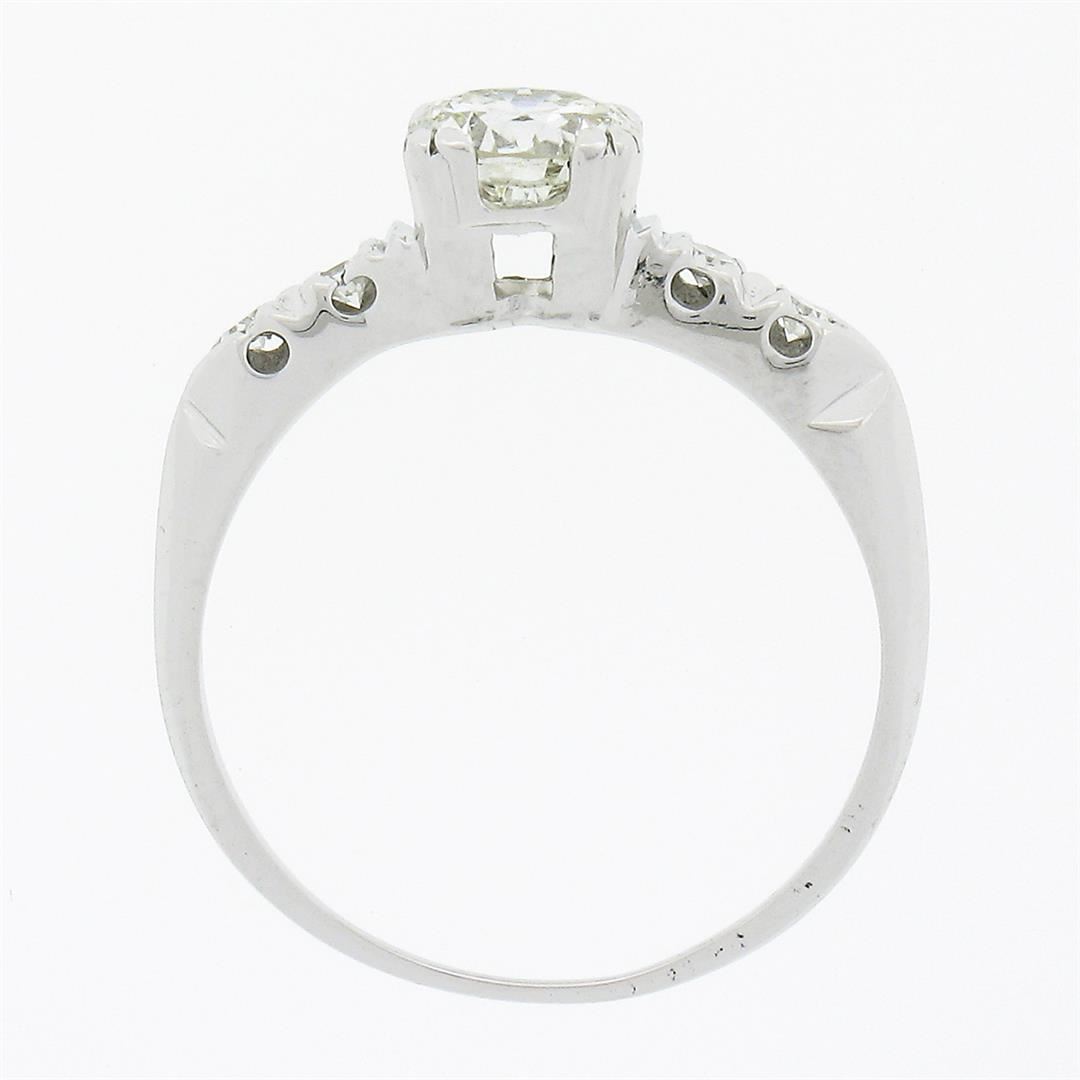 A vintage solid 14k white gold engagement ring, with 1 old transitional cut natural diamond (H - VS2 ; 0.65ct ), accented with 4 old single cut natural diamonds (G/H - VS1/VS2 ; 0.08ctw). The ring is size 5.5, weighs a total of 1.61 grams, and measures 5.6mm wide.