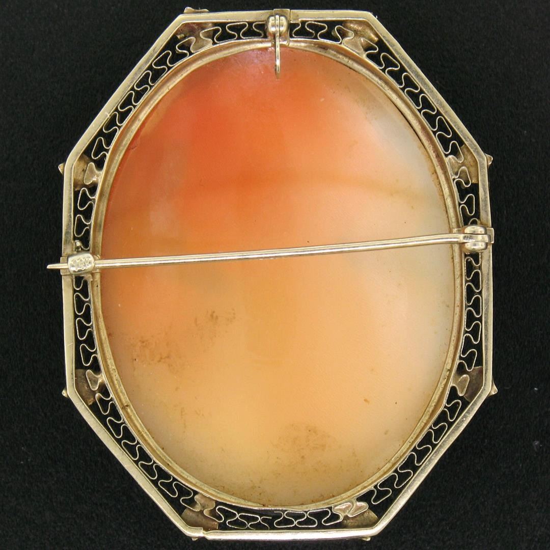 A vintage pendant or brooch featuring an oval genuine carved shell came (45.55x34.65mm) bezel set in a solid 14k white gold frame. Measures 50.20x40.90mm and weighs a total of 14.71 grams.
