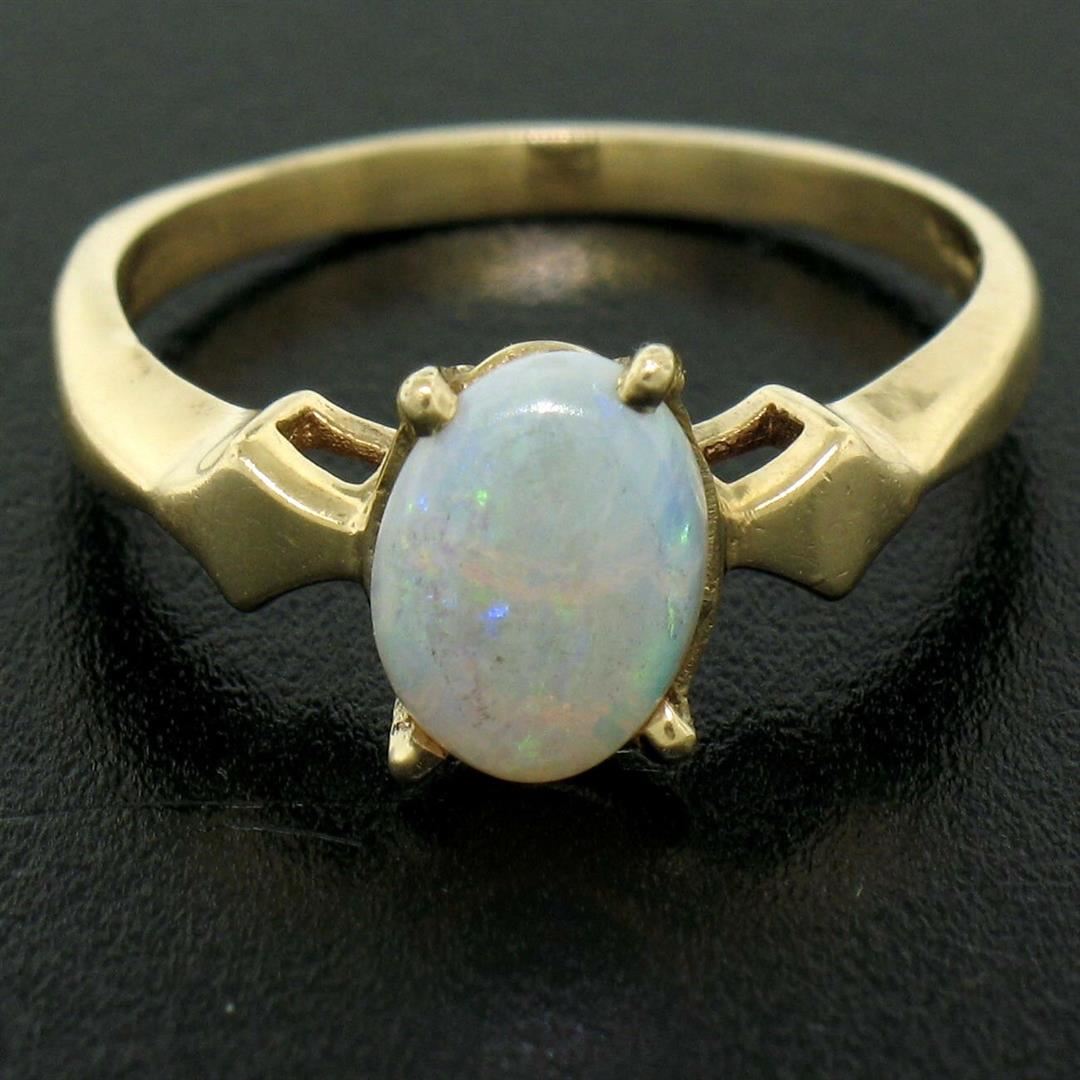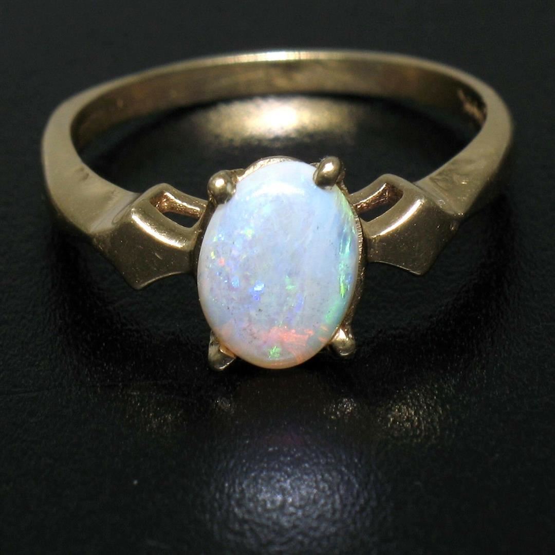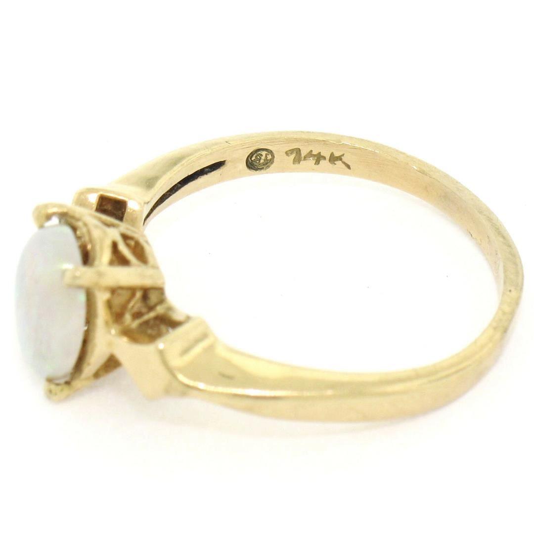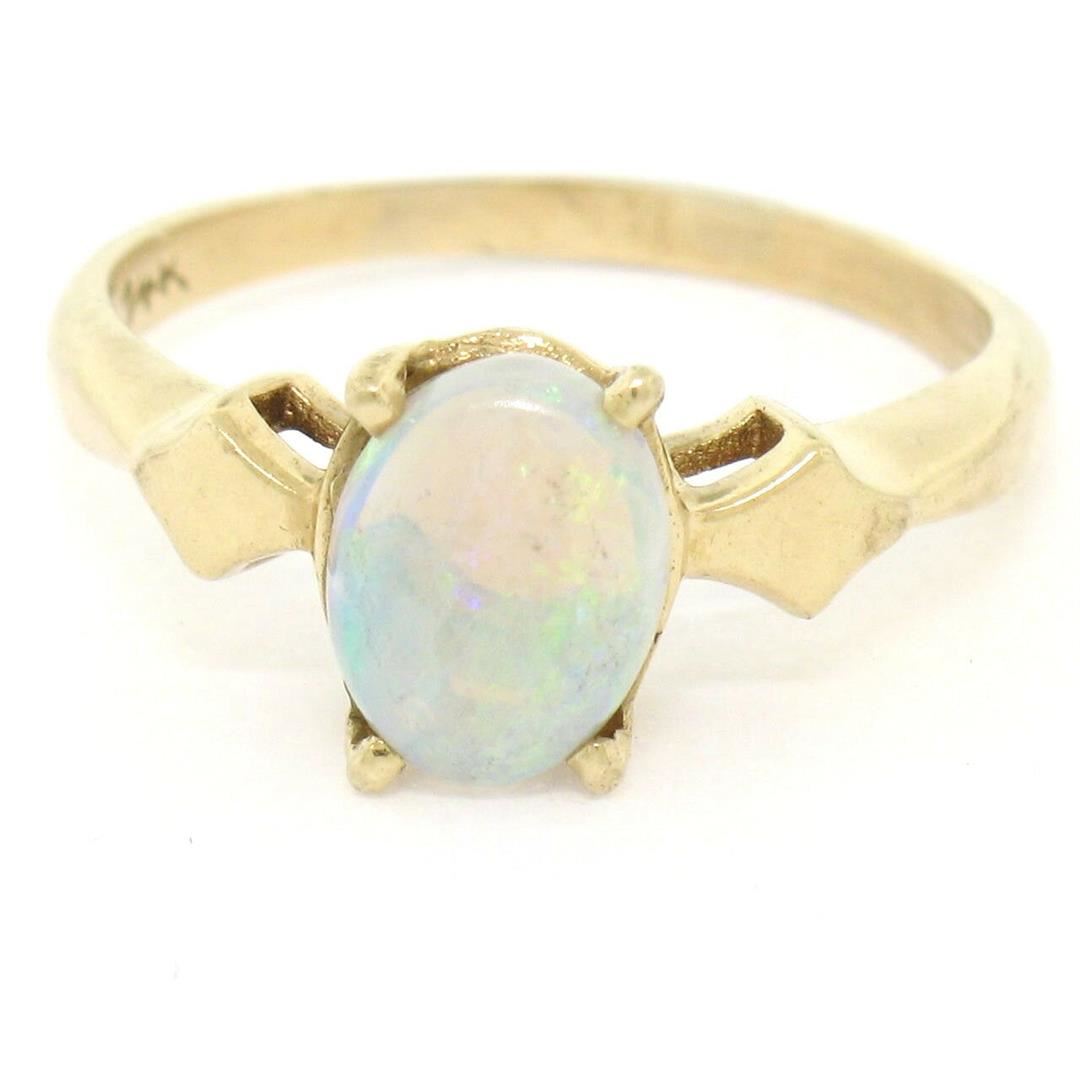One Vintage 14K Yellow Gold 0.65ct Petite Oval Cabochon Opal Solitaire Ring Size 6. Item Details: Material: 14K Solid Yellow Gold, Weight: 2.38 Grams, Stone(s): (1) Natural Genuine Opal - Oval Cabochon Cut - Prong Set - White w/ Green, Blue, and Red Play - 8.18x5.9mm / 0.65ct (approx.), Ring Size: 6.0 , Ring Width: 8.22mm, Ring Height: 6.12mm rise off the finger, Condition: Vintage ring. Excellent, ready to wear condition!,