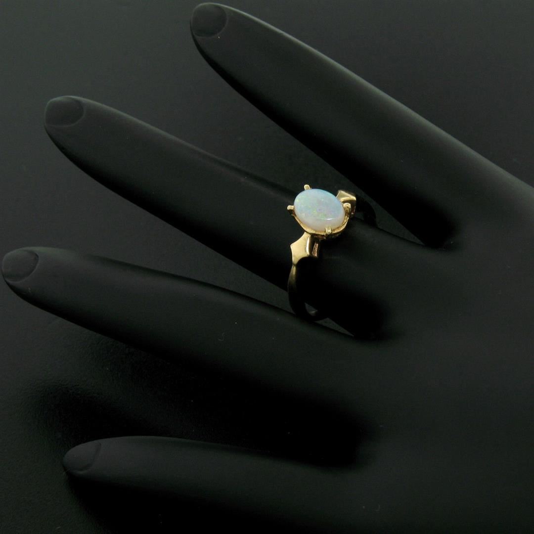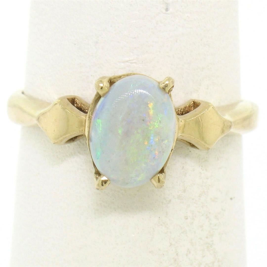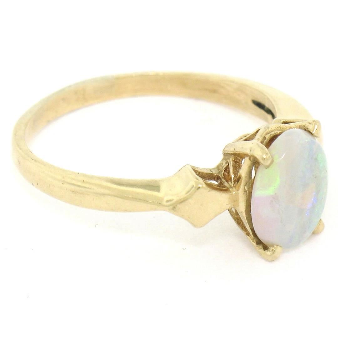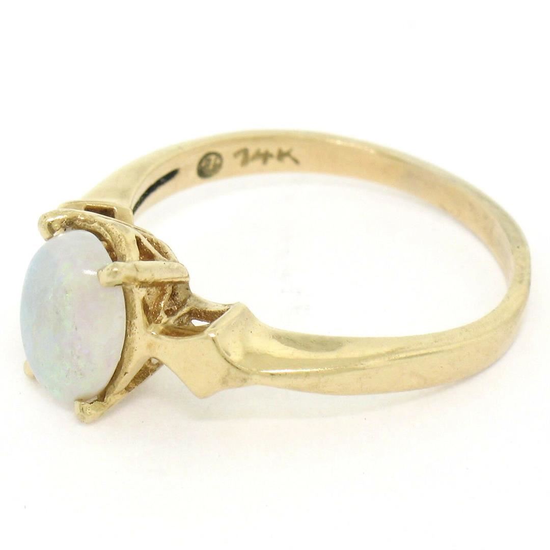One Vintage 14K Yellow Gold 0.65ct Petite Oval Cabochon Opal Solitaire Ring Size 6. Item Details: Material: 14K Solid Yellow Gold, Weight: 2.38 Grams, Stone(s): (1) Natural Genuine Opal - Oval Cabochon Cut - Prong Set - White w/ Green, Blue, and Red Play - 8.18x5.9mm / 0.65ct (approx.), Ring Size: 6.0 , Ring Width: 8.22mm, Ring Height: 6.12mm rise off the finger, Condition: Vintage ring. Excellent, ready to wear condition!,