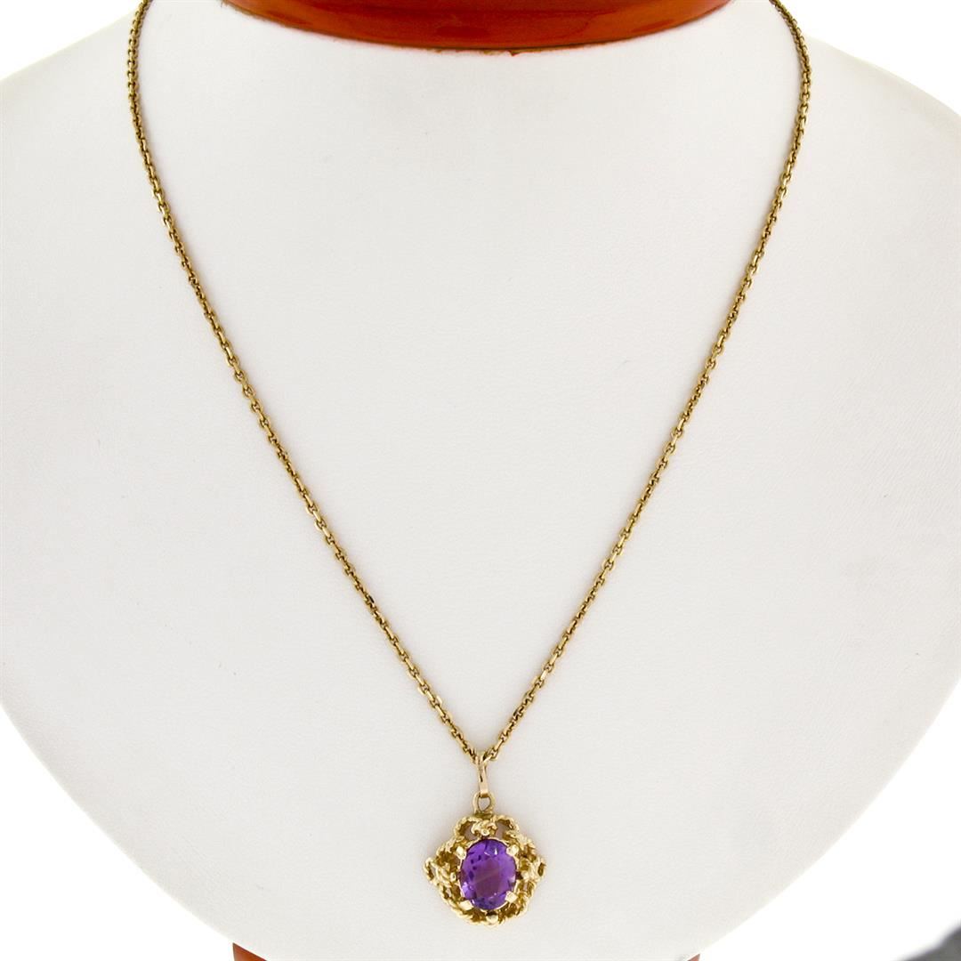 A vintage solid 14k yellow gold pendant necklcae, with 1 oval cut natural amethyst (9.0x7.0mm - 1.75ct). The pendant weighs a total of 6.94 grams, measures 22.50x16.20mm including the bail, and 16 inch thick cable link chain