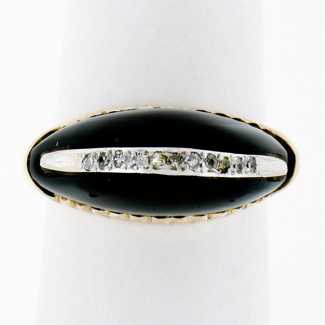 A vinatge solid 14k yellow gold ring, with 1 domed custom cut natural black onyx, and 11 old single cut natural diamonds (H/I - VS2 ; 0.13ctw). The ring is size 6.5, weighs a total of 6.42 grams, and measures 9.0mm wide.