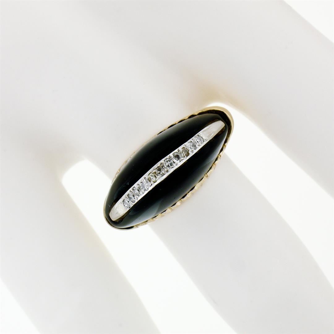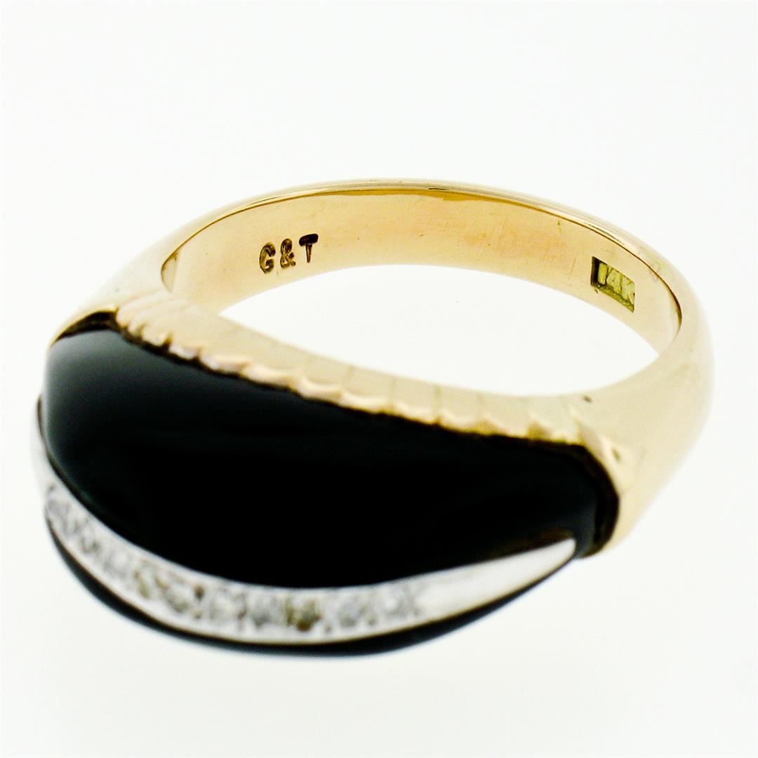 A vinatge solid 14k yellow gold ring, with 1 domed custom cut natural black onyx, and 11 old single cut natural diamonds (H/I - VS2 ; 0.13ctw). The ring is size 6.5, weighs a total of 6.42 grams, and measures 9.0mm wide.